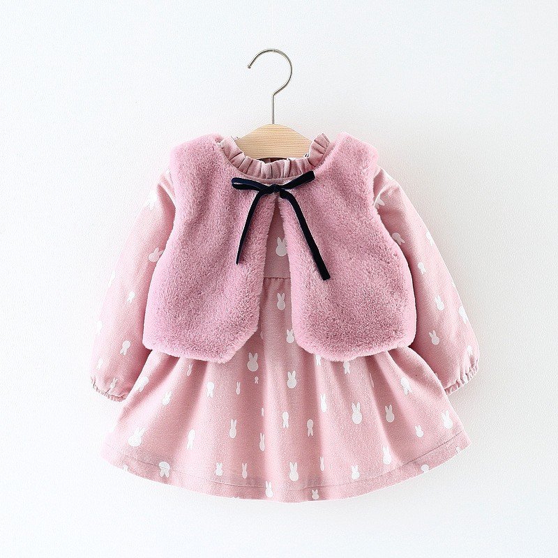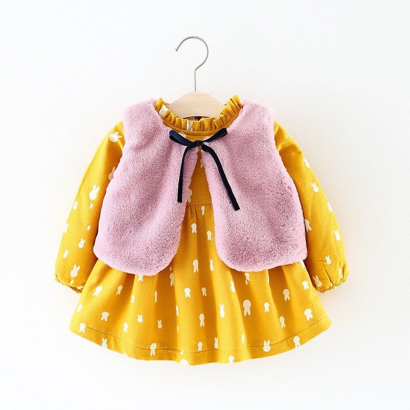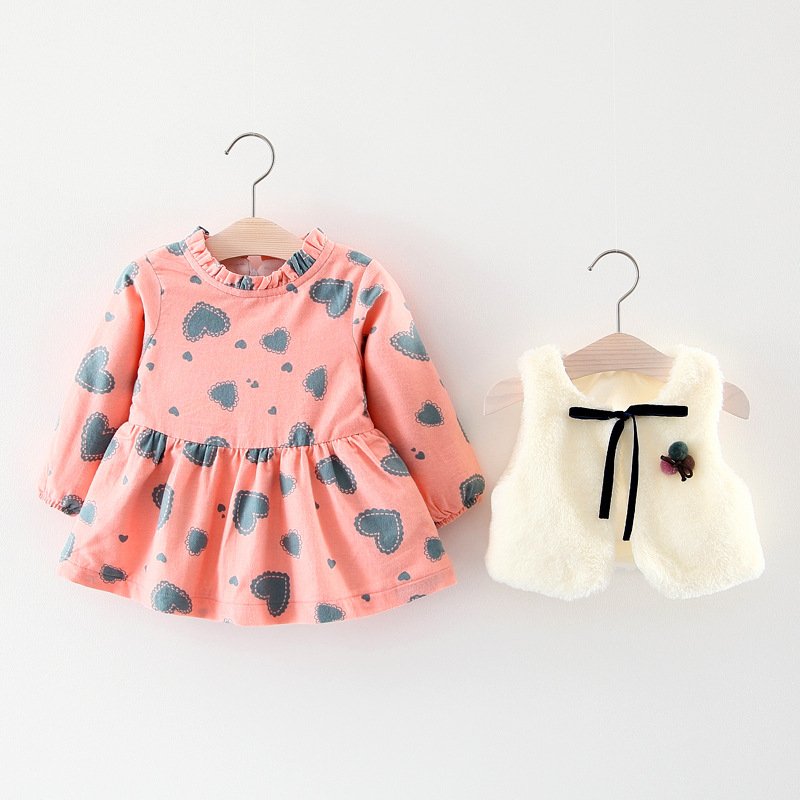 Girl Autumn And Winter Warm Information Printed Long Sleeve Dress And Plush Vest Two-Piece Set