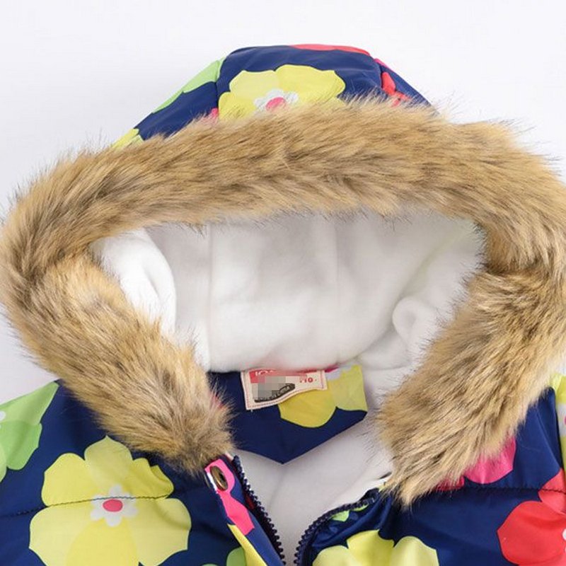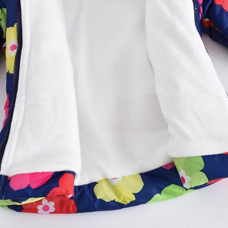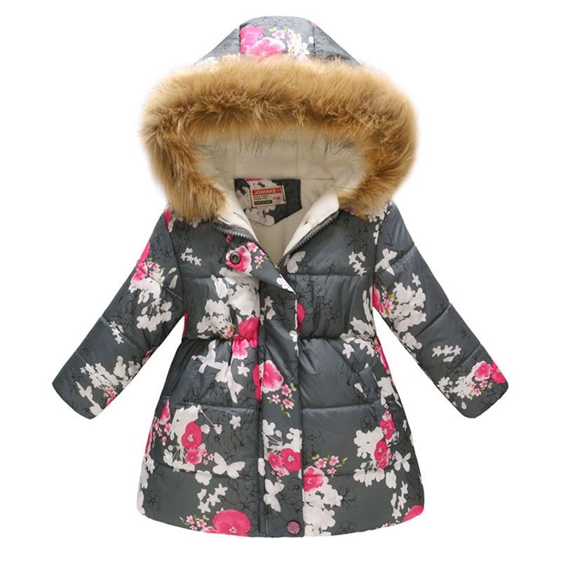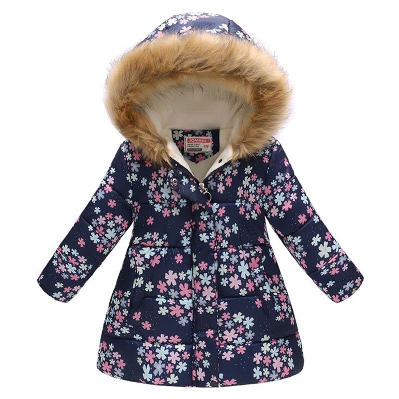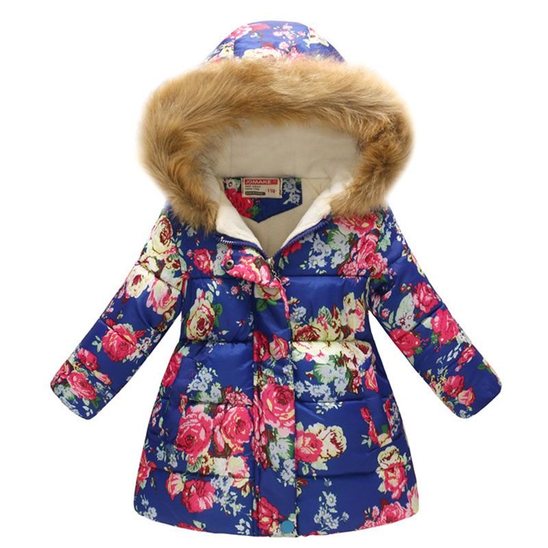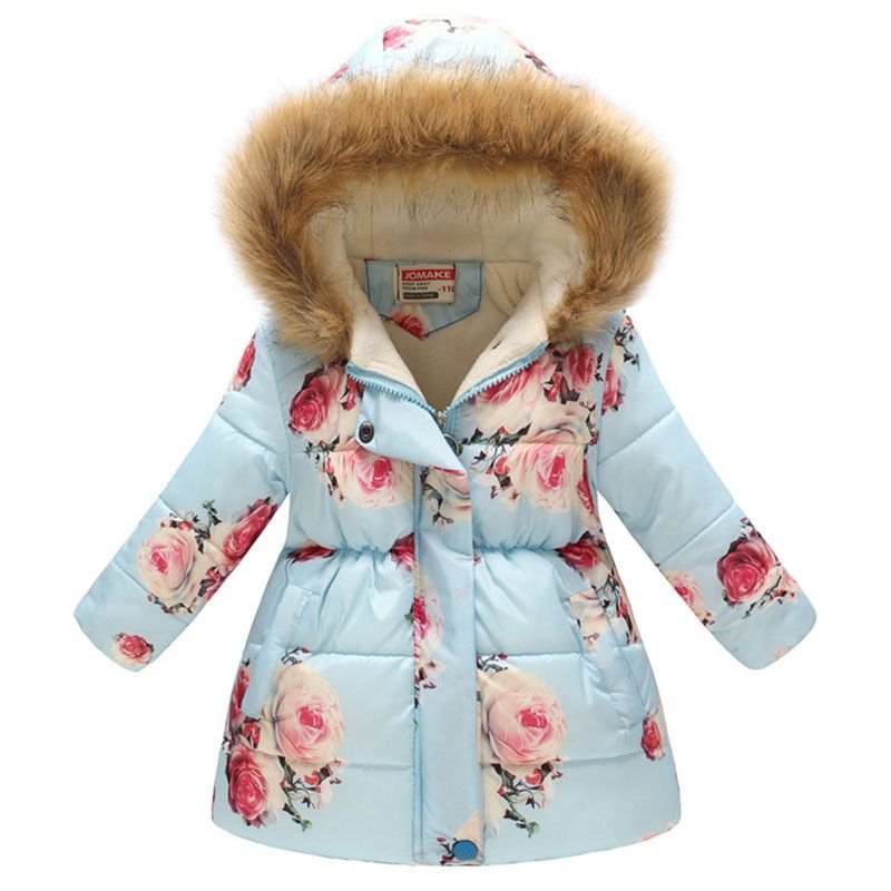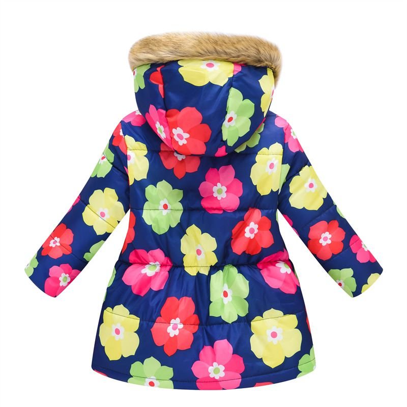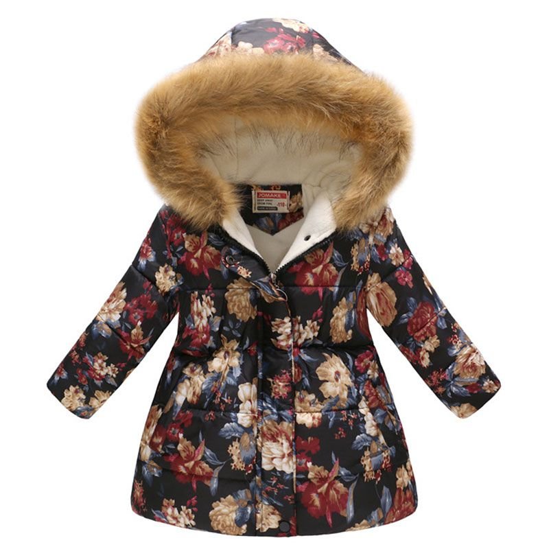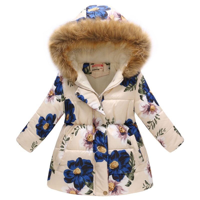 Girl Autumn Winter Flower Print Fur Collar Hooded Coat