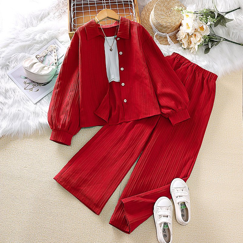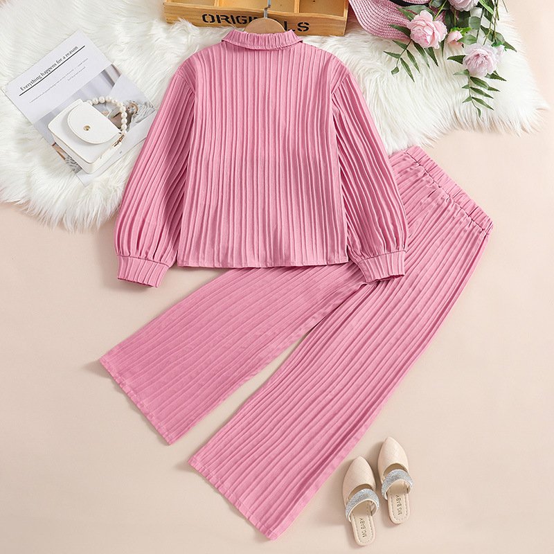 Girl Fashion Casual Solid Color Stripe Lapel Long Sleeve Top Loose Pants Two-Piece Set