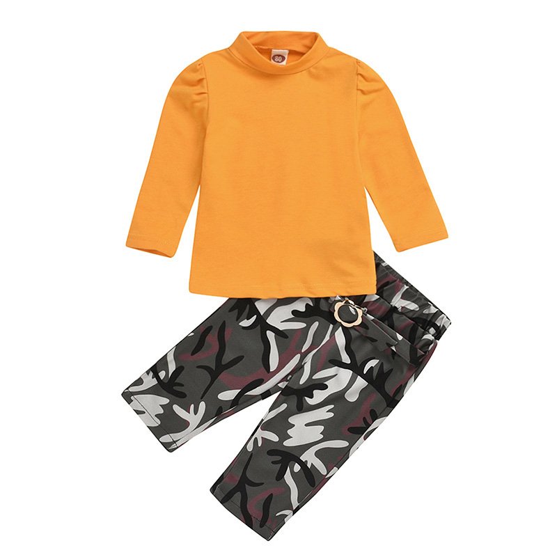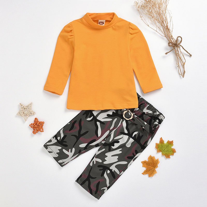 Girl Solid Color Long Sleeve Top And Camouflage Printed Pants Set