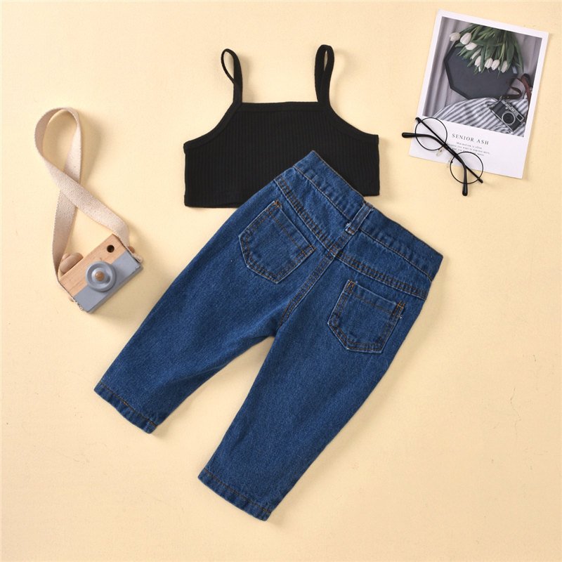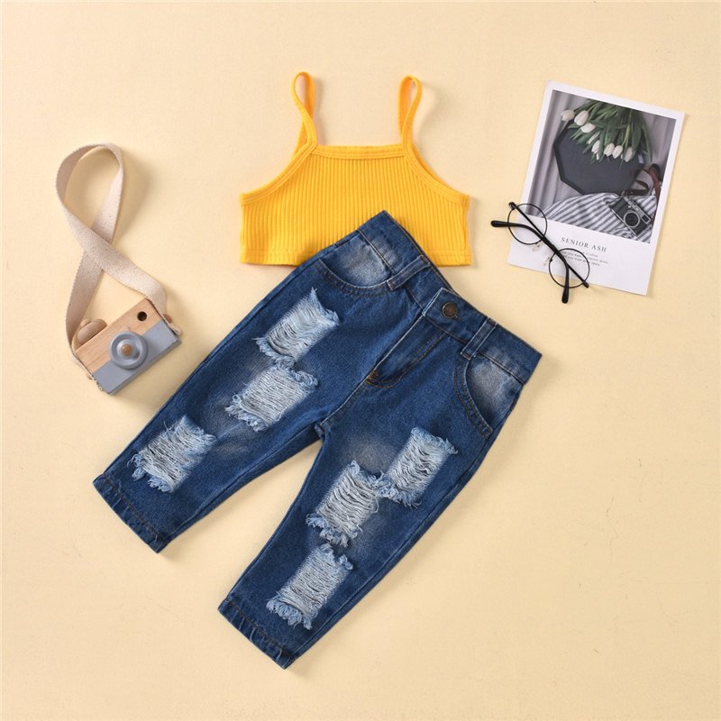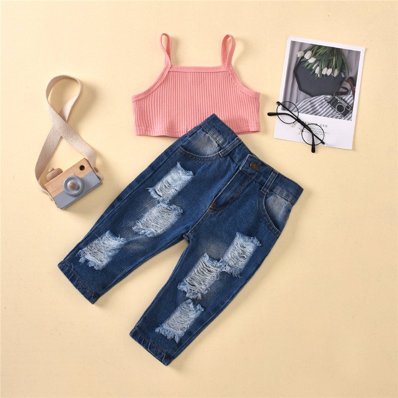 Girl Solid Color Striped Top And ripped Jeans Tow Pieces Set
