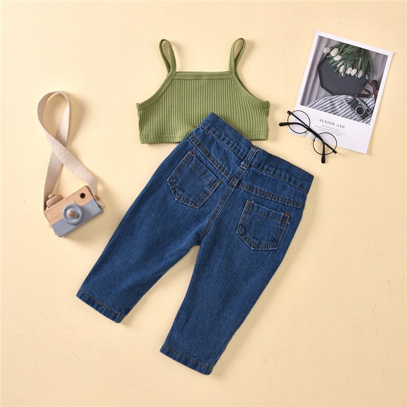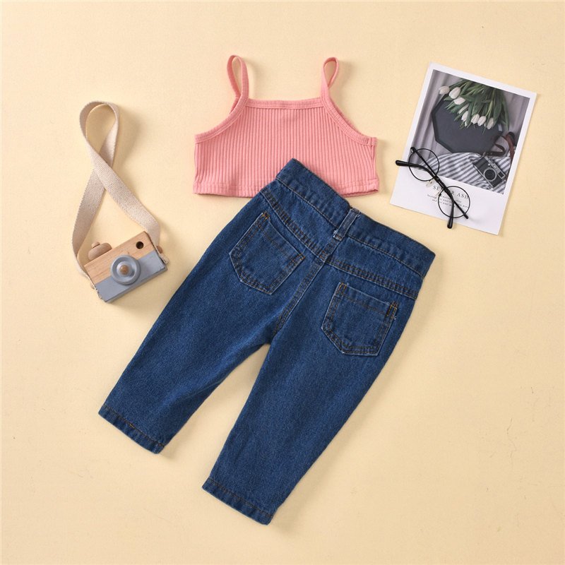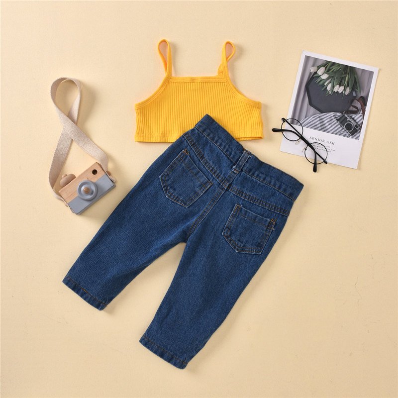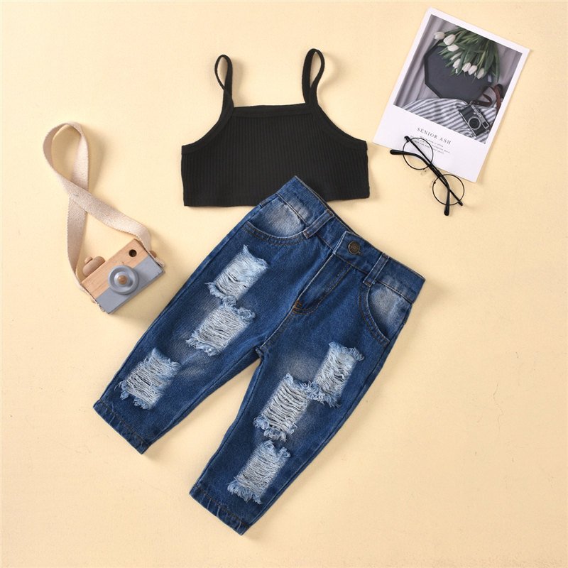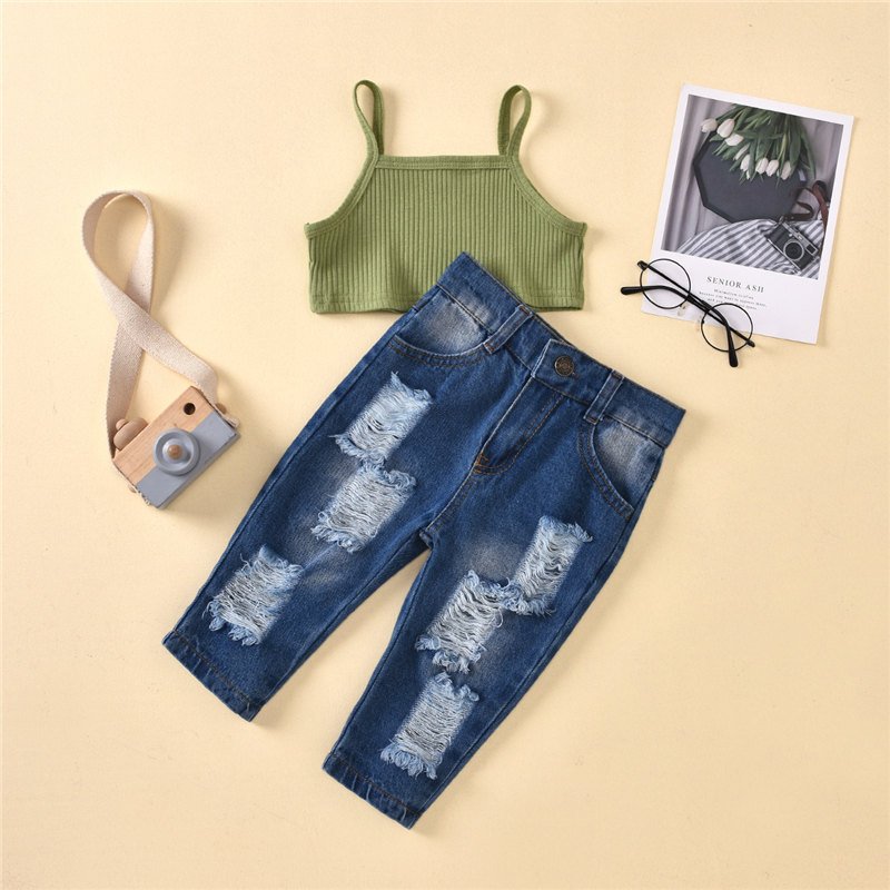 Girl Solid Color Striped Top And ripped Jeans Tow Pieces Set