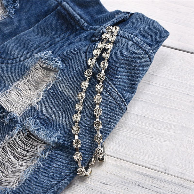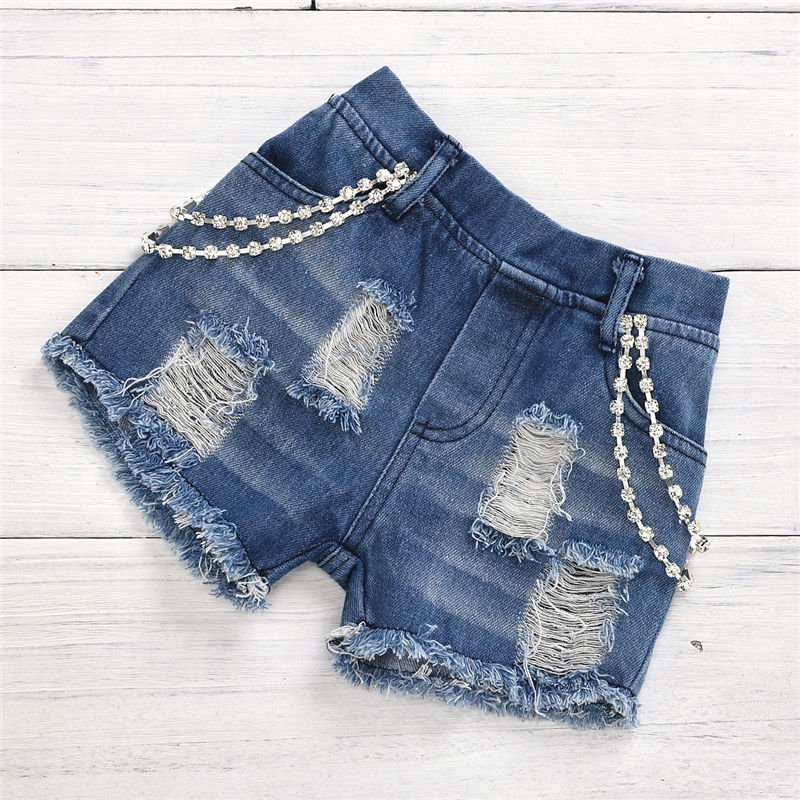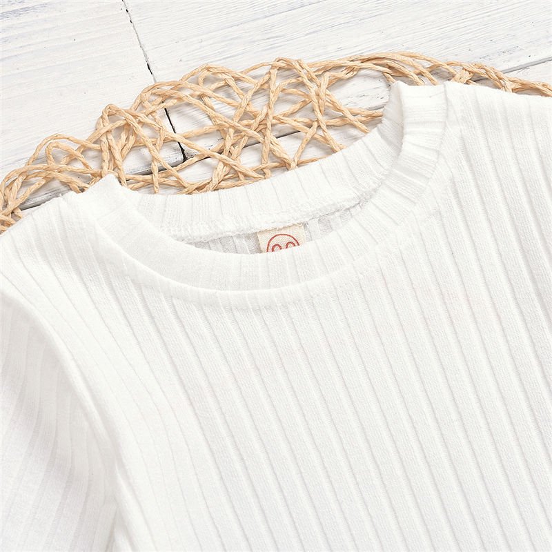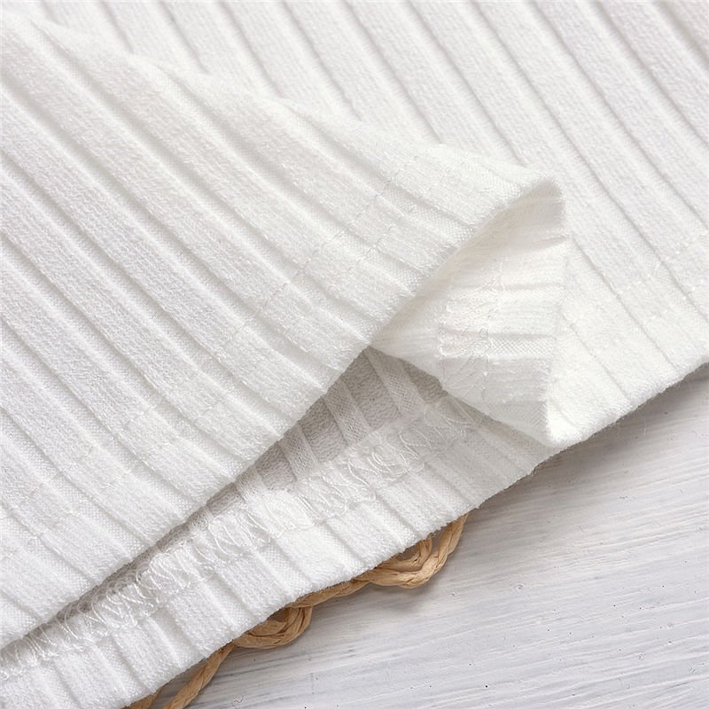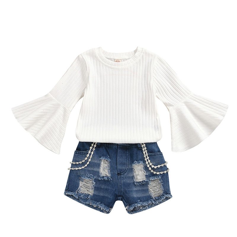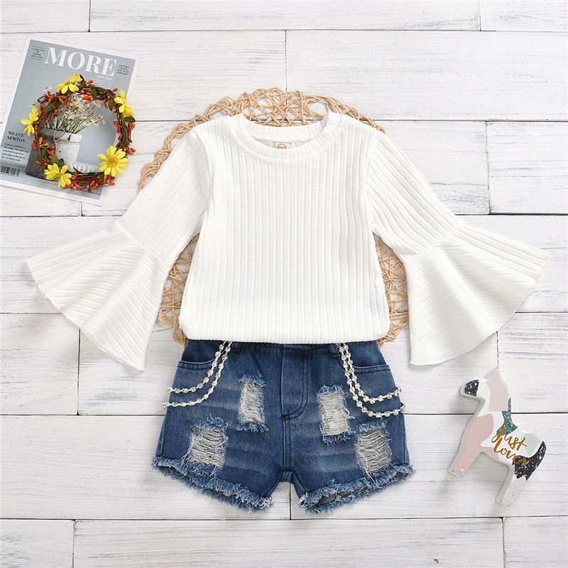 Girl White Knitted Flared Sleeve Tops And Ripped Denim Shorts Set