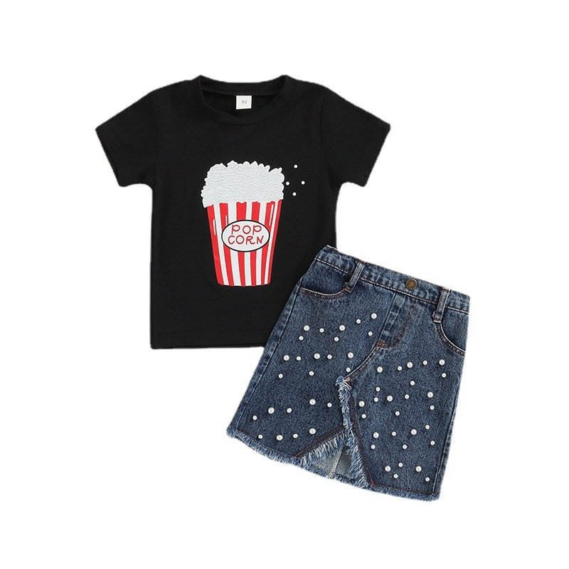 Girls Basic Popcorn Printed Round Neck Short Sleeve T-Shirt And Slit Beaded Denim Skirt Two-piece Set