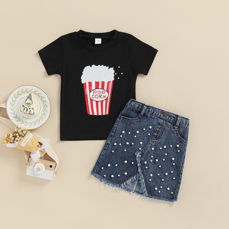 Girls Basic Popcorn Printed Round Neck Short Sleeve T-Shirt And Slit Beaded Denim Skirt Two-piece Set