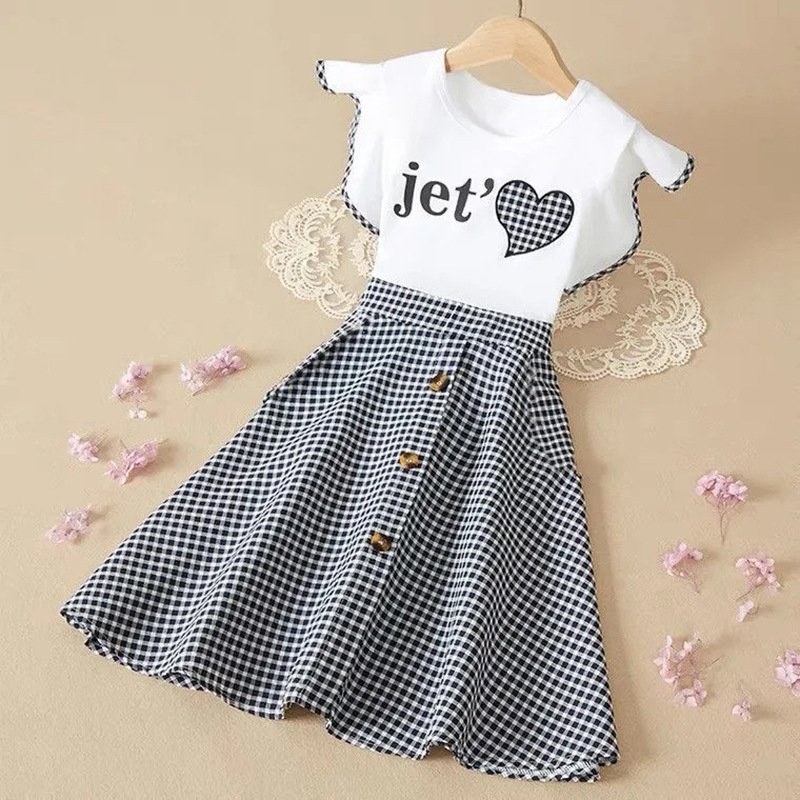 Girls Basic Round Neck Letter Pattern Plaid Dress