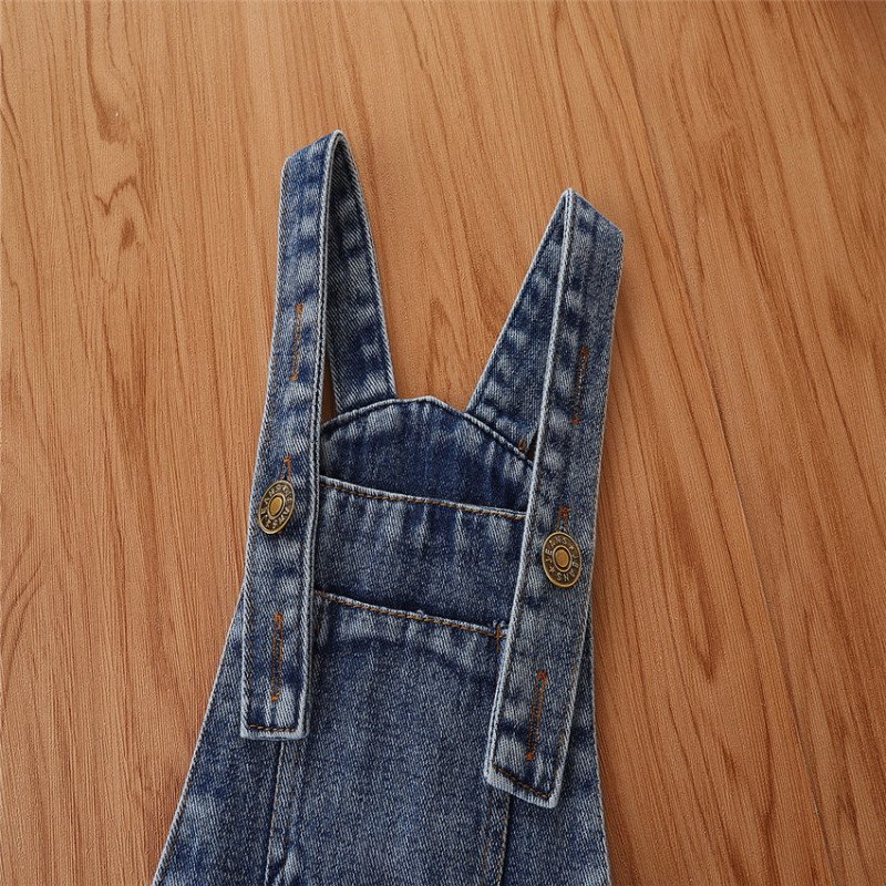 Girls Basic Solid Color Long Sleeve Round Neck Romper And Denim Suspender Skirt With Headband Set