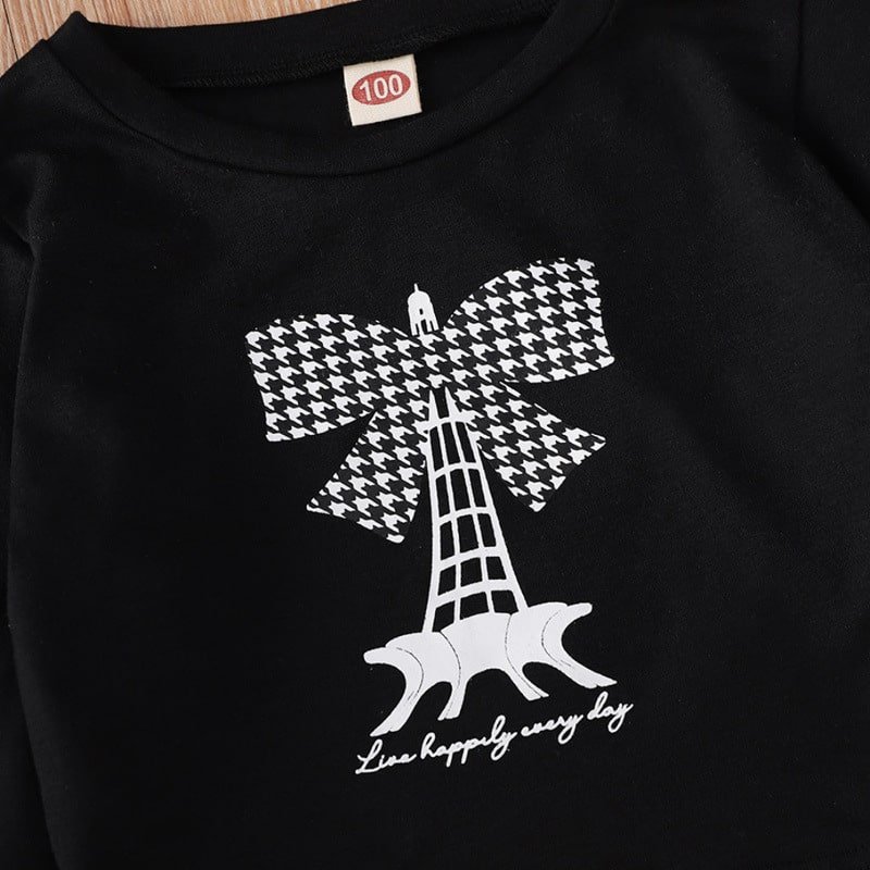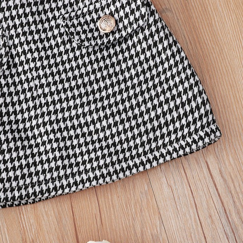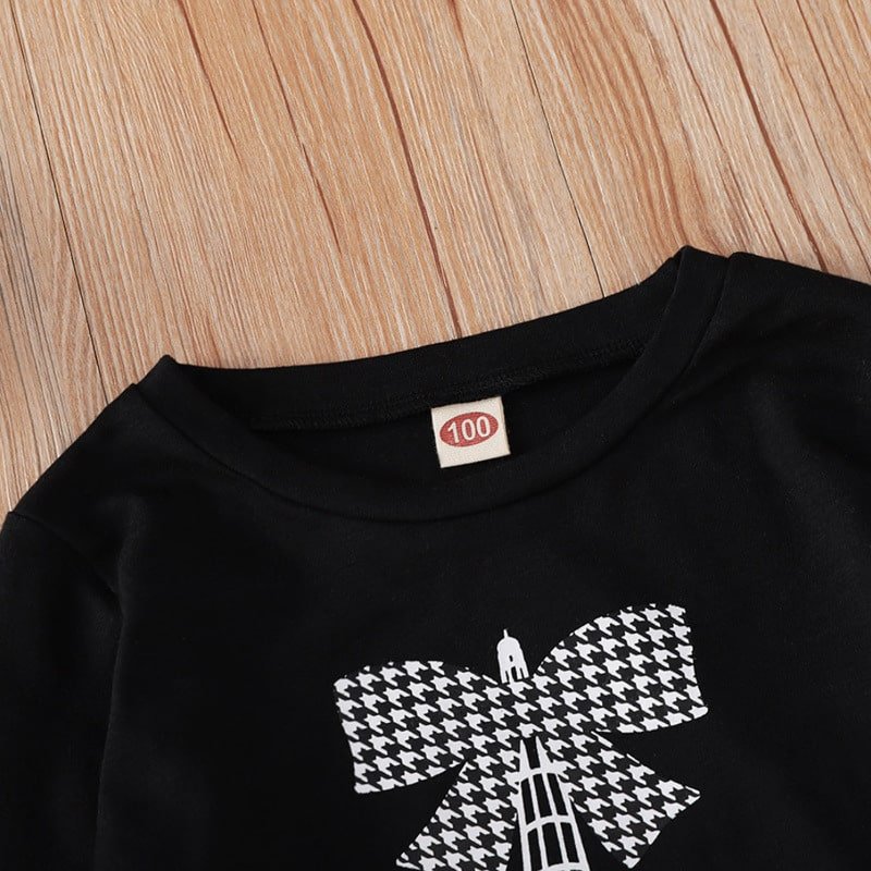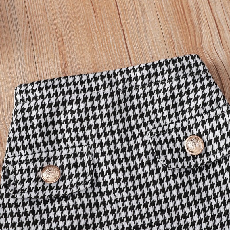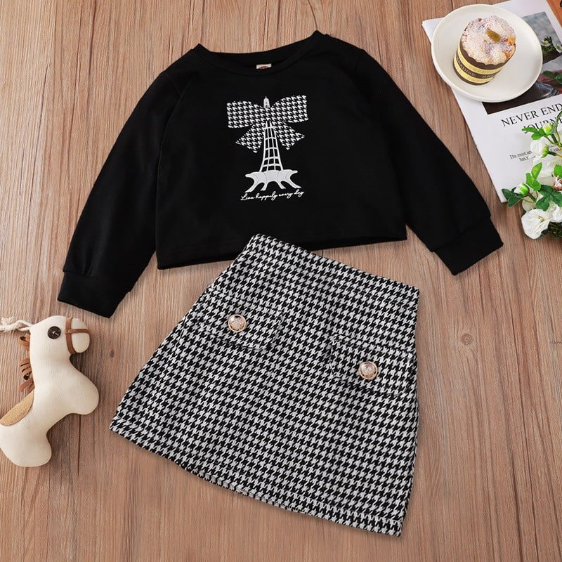 Girls Casual Bow Pattern Long Sleeve Top And Houndstooth Skirt Set