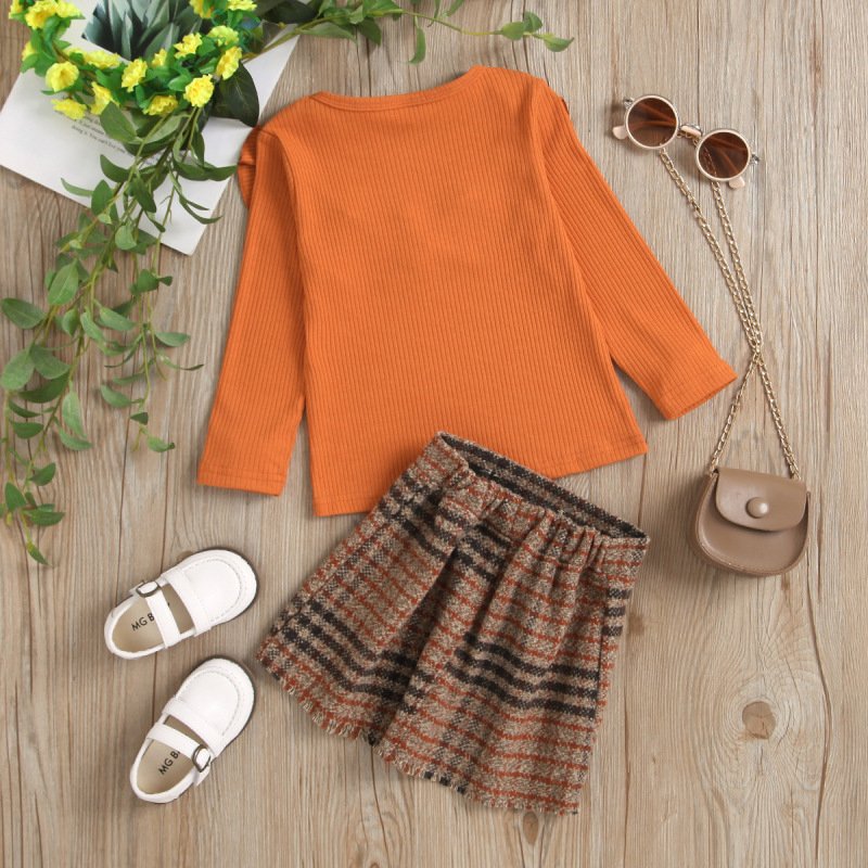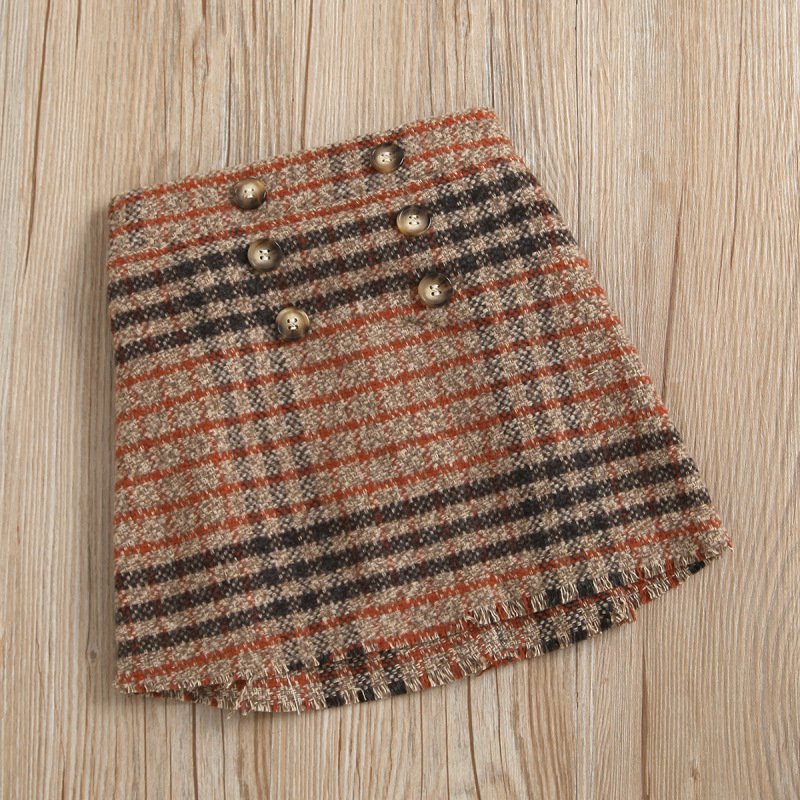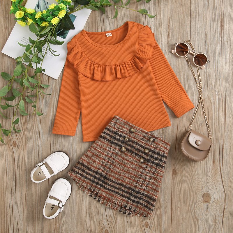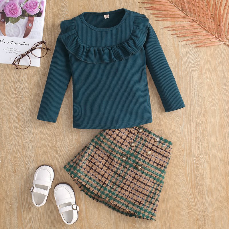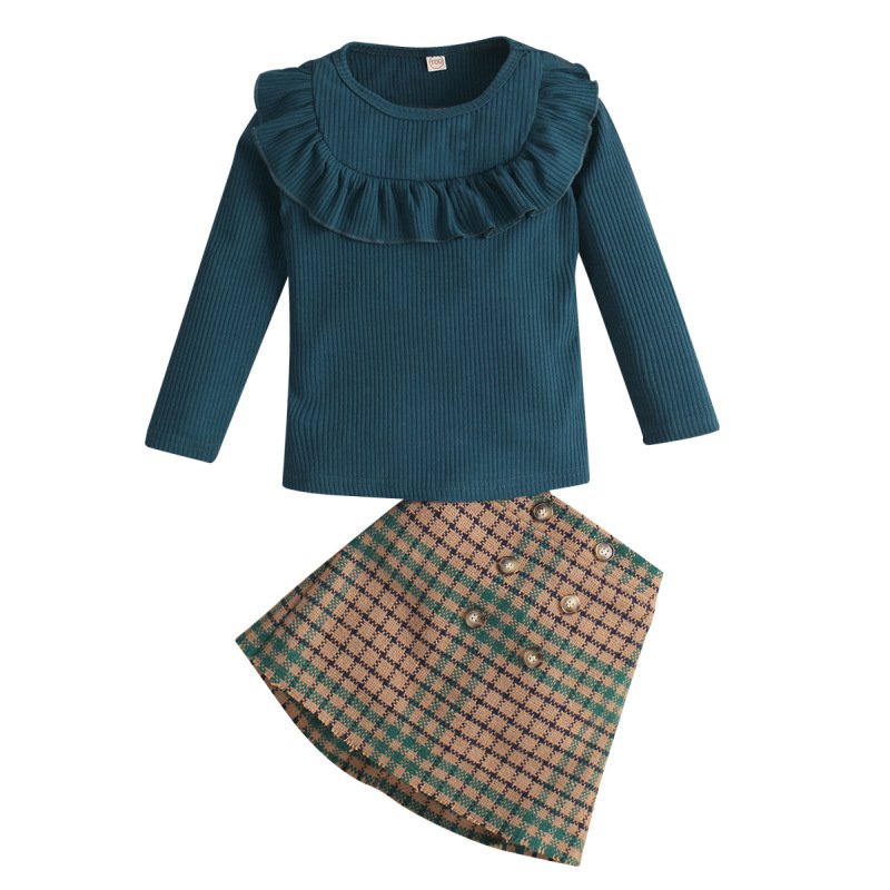 Girls Casual Ruffled Round Neck Long Sleeve Knit Top And Plaid Skirt Two Piece Set