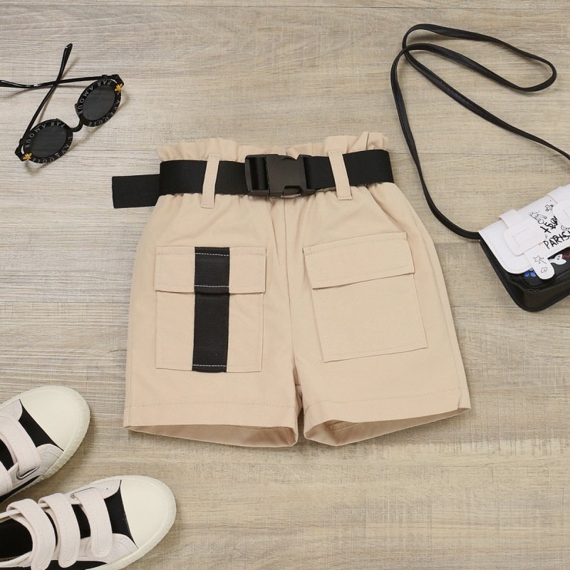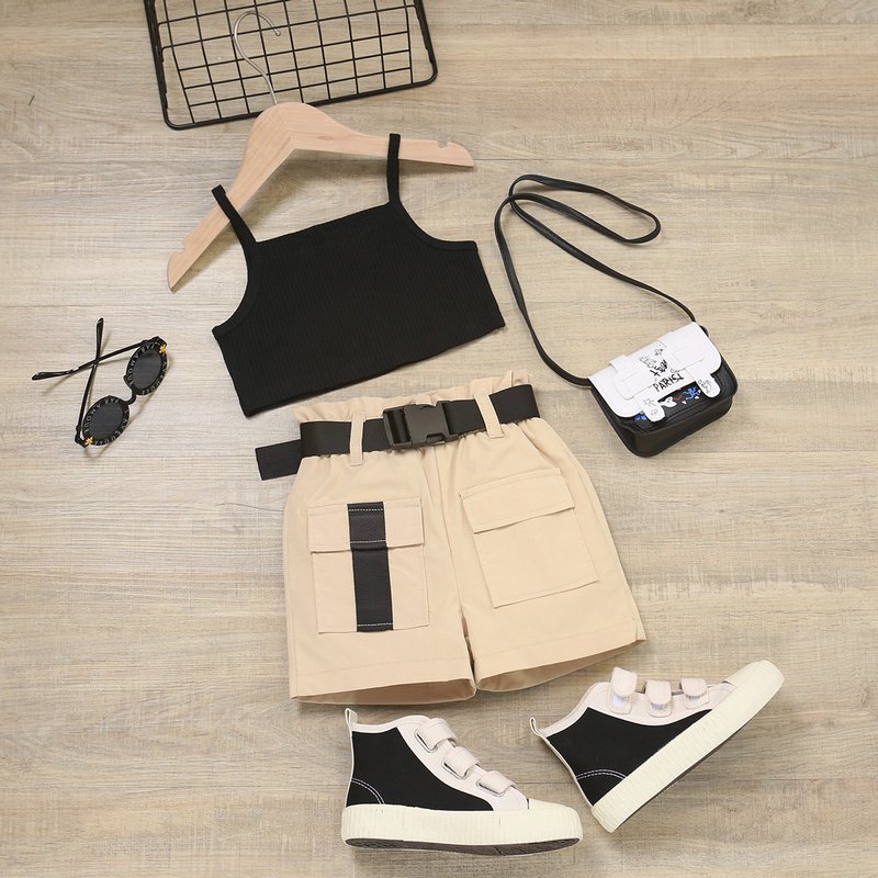 Girls Casual Solid Color Camisole And Cargo Shorts Set
