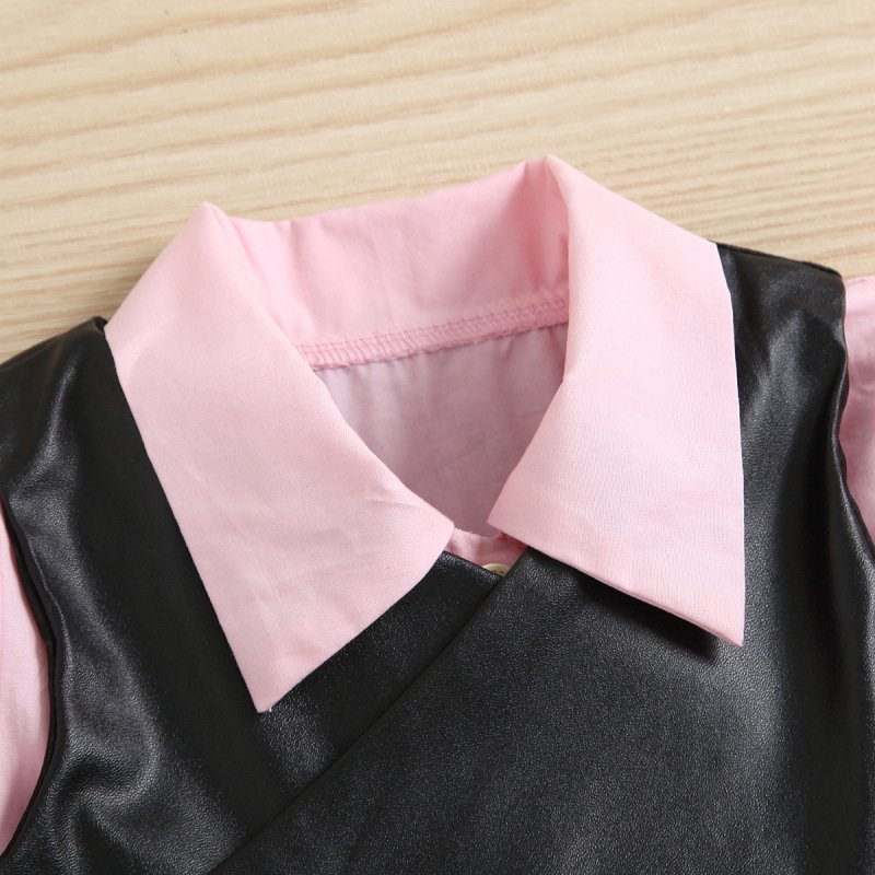 Girls Casual Solid Color Lapel Long Sleeve Single-breasted Shirt Dress With PU Vest