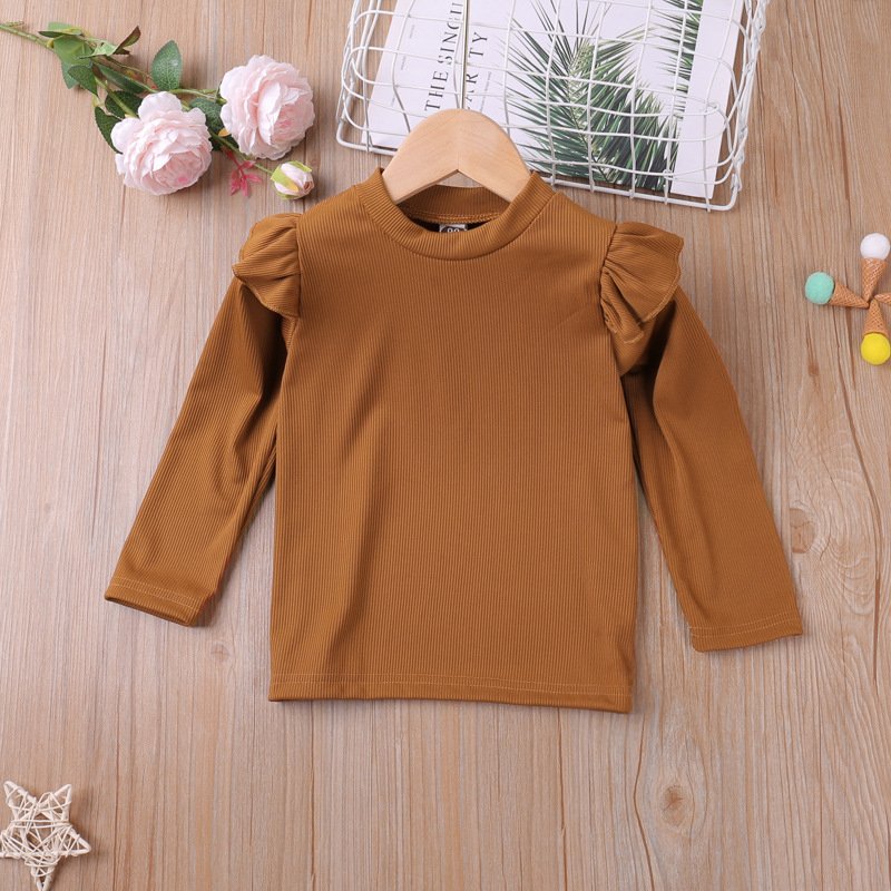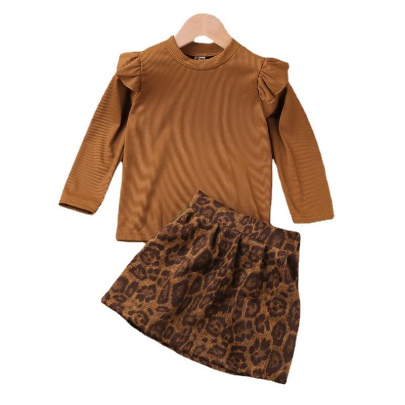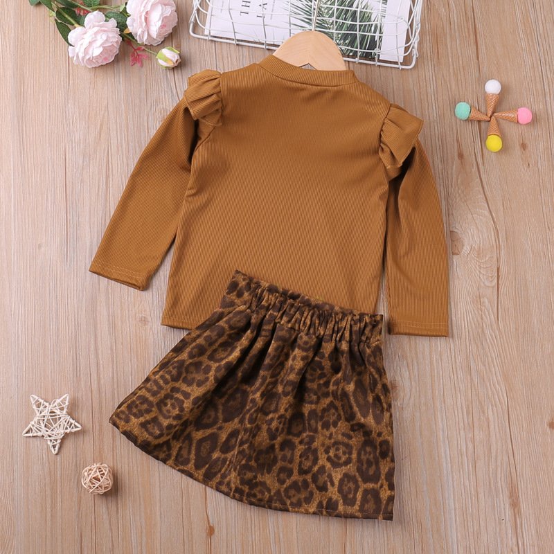 Girls Casual Solid Color Round Neck Stringy Selvedge Long Sleeve Top And Leopard Skirt Two-piece Set