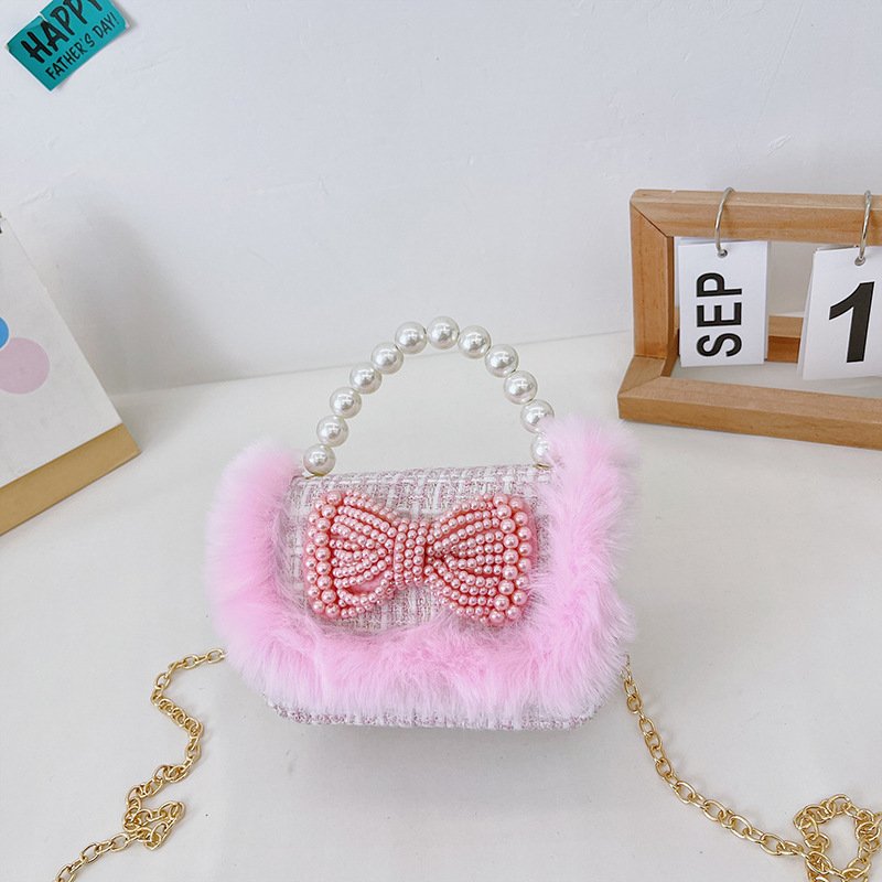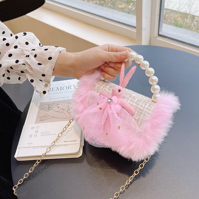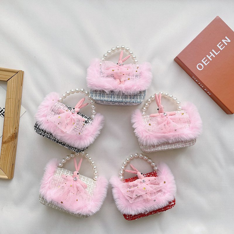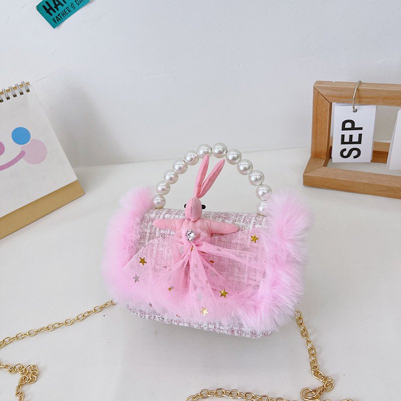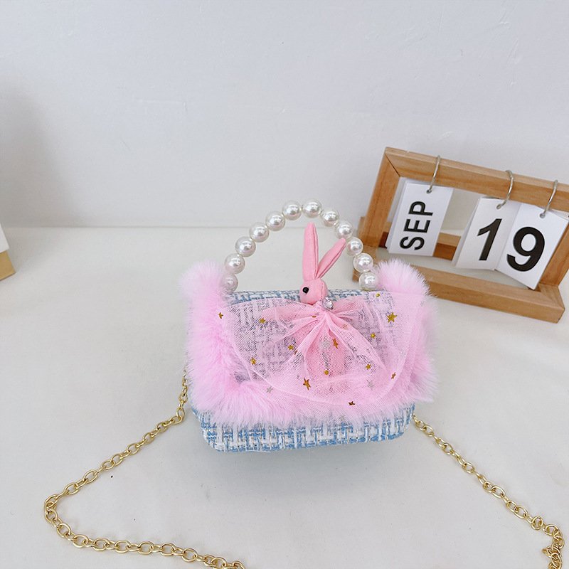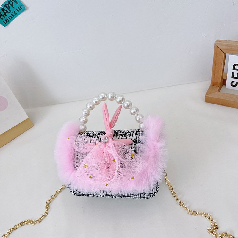 Girls Cute Bowknot Bunny Plush Pearl Metal Chain Handle Crossbody Bag