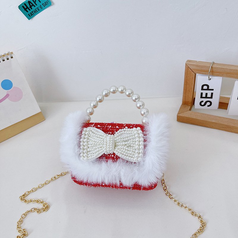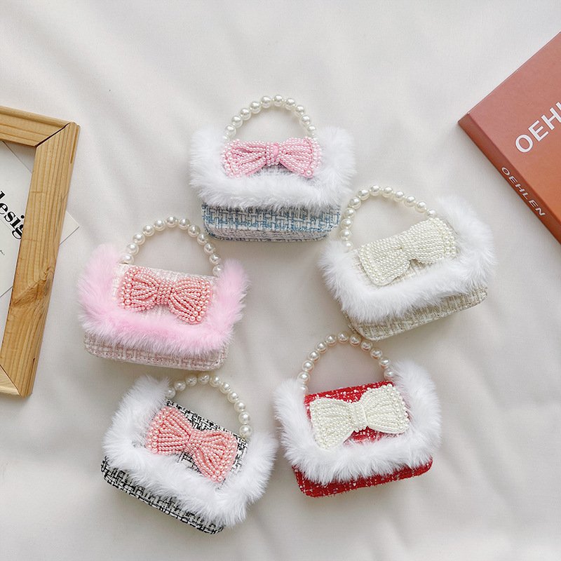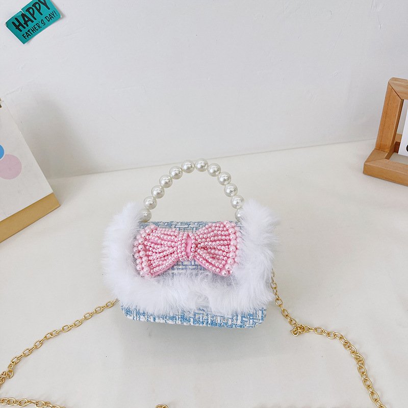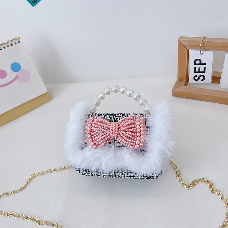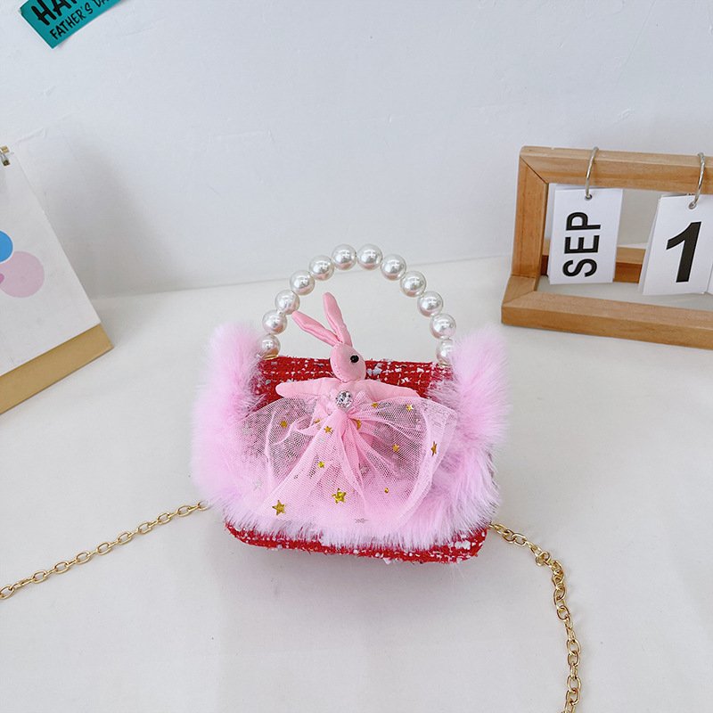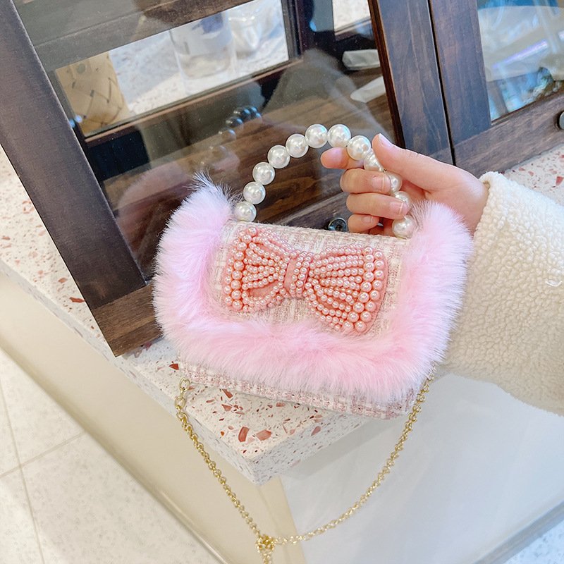 Girls Cute Bowknot Bunny Plush Pearl Metal Chain Handle Crossbody Bag