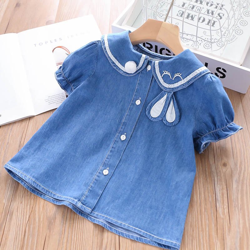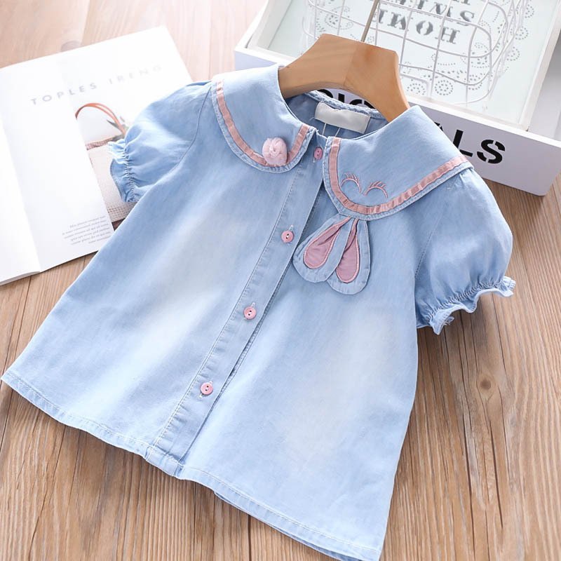 Girls Cute Cartoon Rabbit Short Sleeve Single-breasted Blouse And Mesh Skirt Set