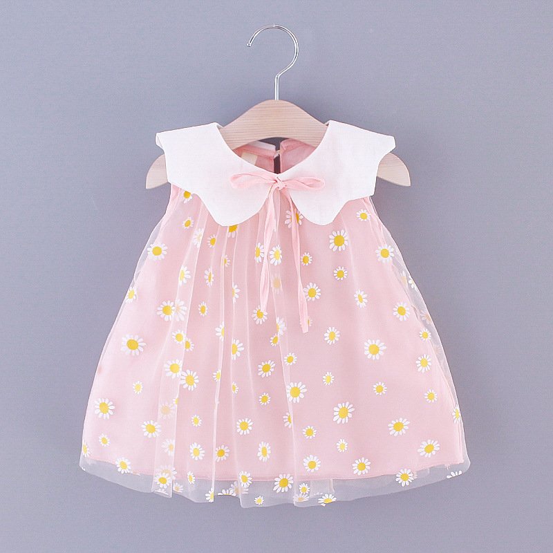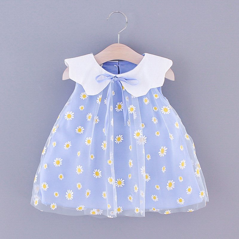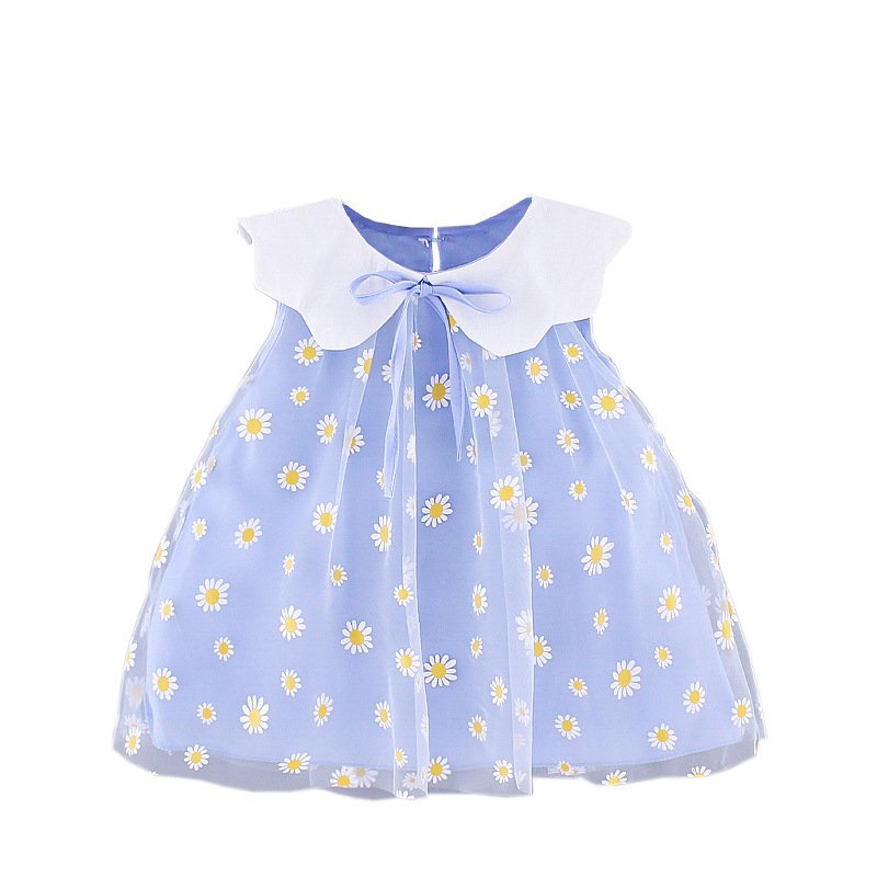 Girls Cute Daisy All Over Print Big Lapel Sleeveless Mesh Dress