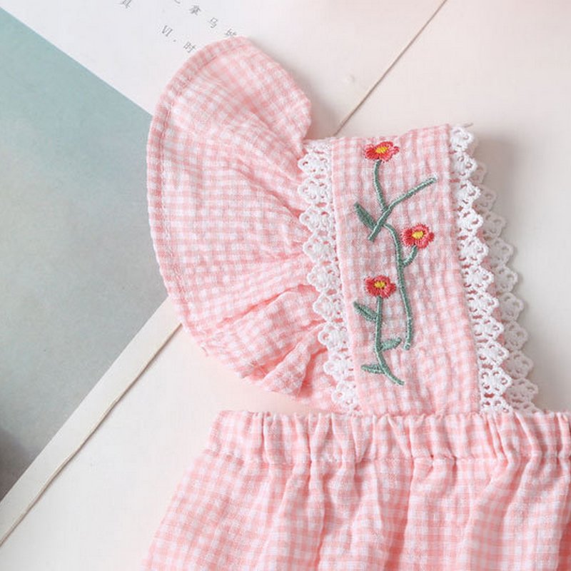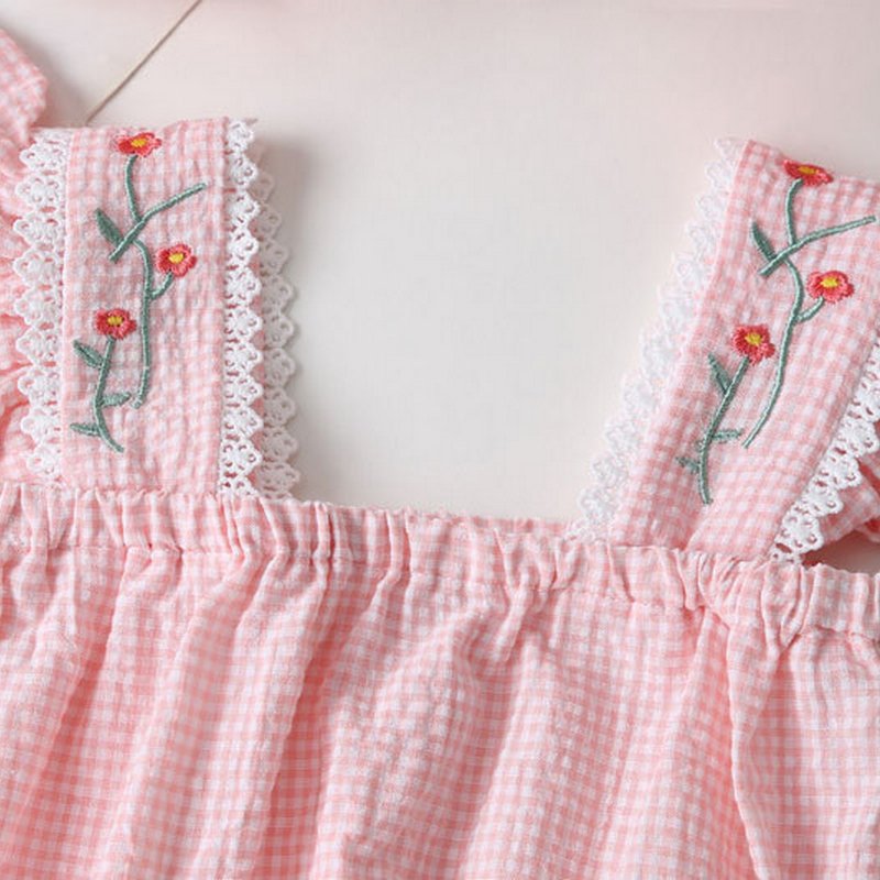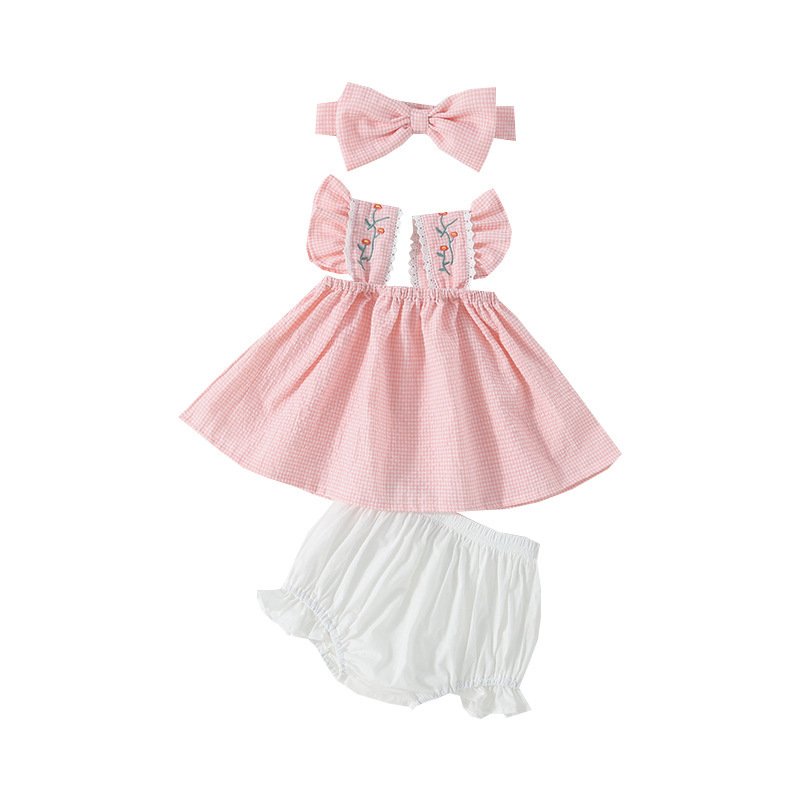 Girls Cute Flower Embroidery Plaid Top And Shorts With Headband Set