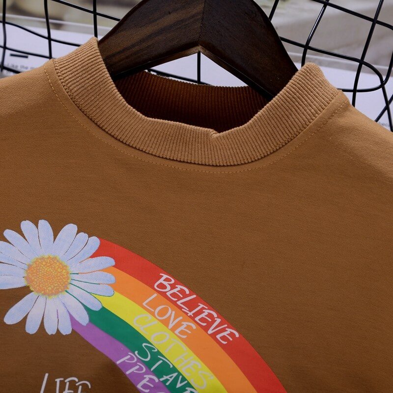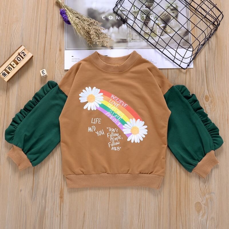 Girls Cute Round Neck Bubble Sleeves Rainbow Pattern Sweatshirt