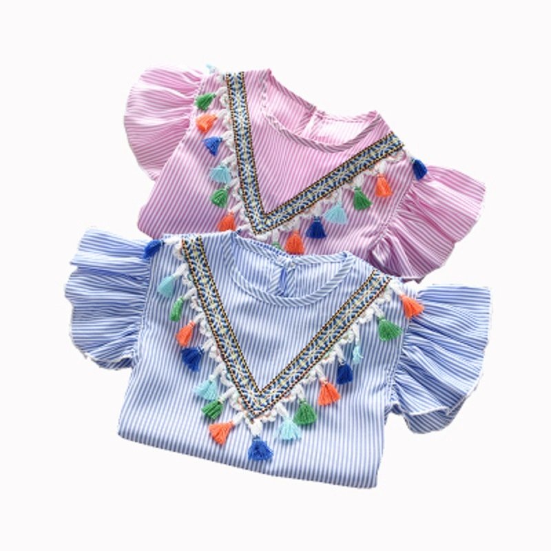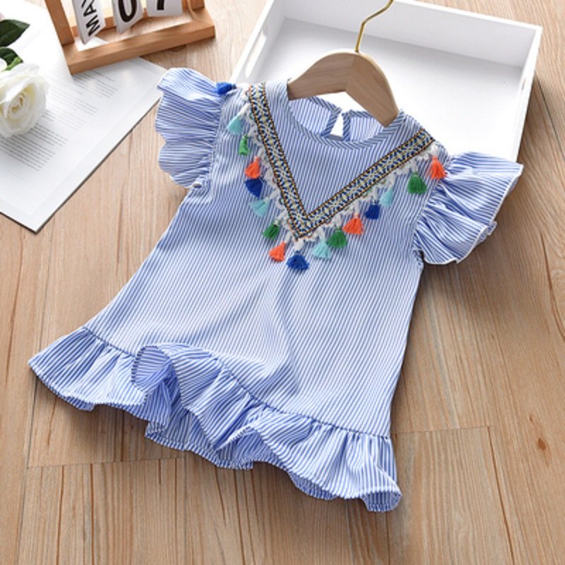 Girls Ethnic Round Neck Short Sleeve Ruffled Striped Dress