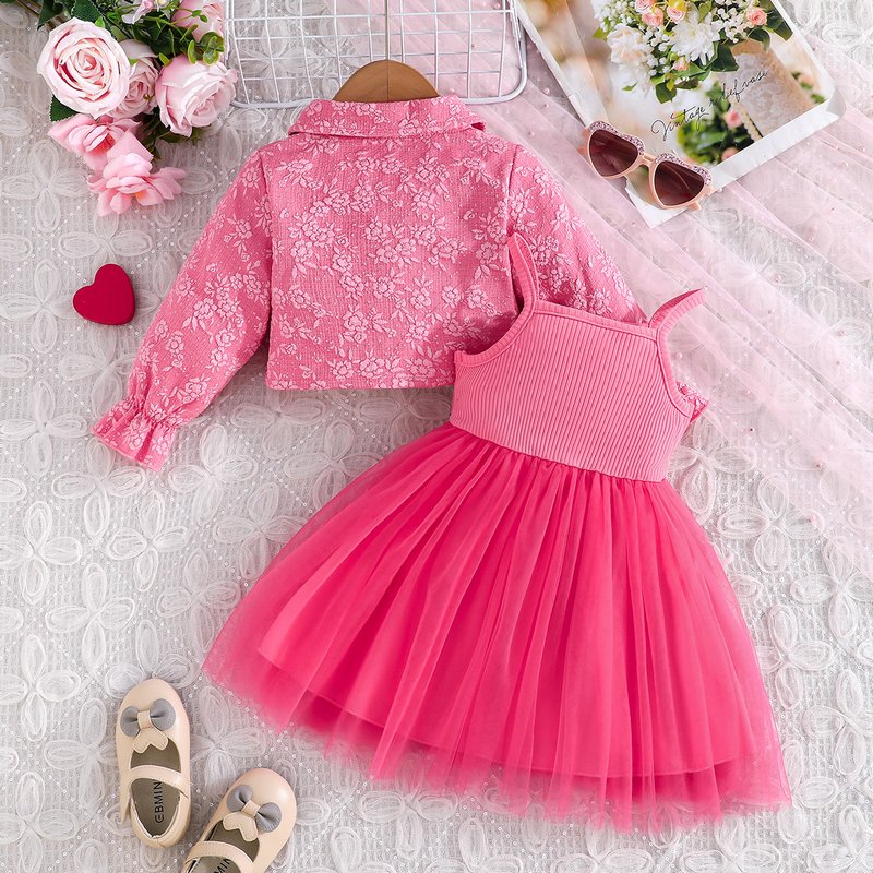Girls Fashion Autumn Printed Love Long-Sleeve Coat Mesh Dress Two-Piece Set