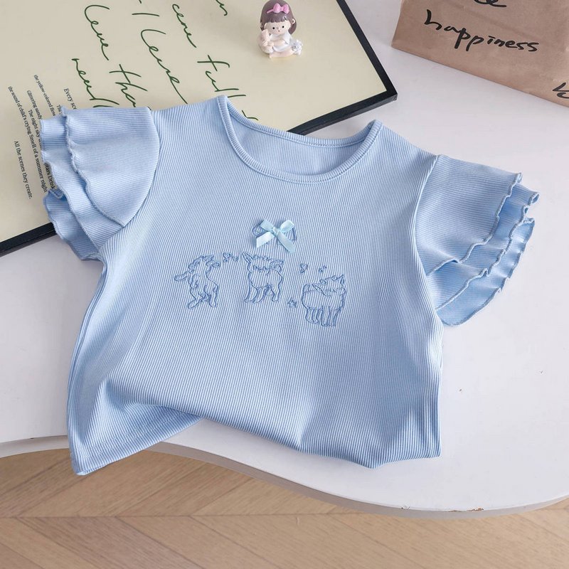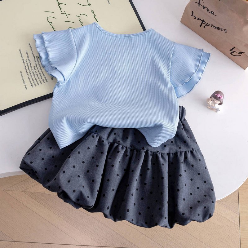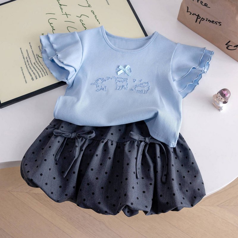 Girls Fashion Blue Edge Curl Short-Sleeve T-Shirt Wave Point Shorts Two-Piece Set