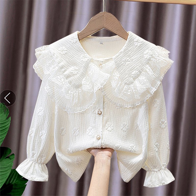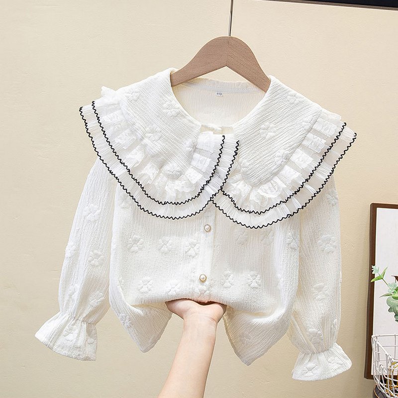 Girls Fashion Casual Jacquard Ruffled Lapel Long Sleeve Blouse