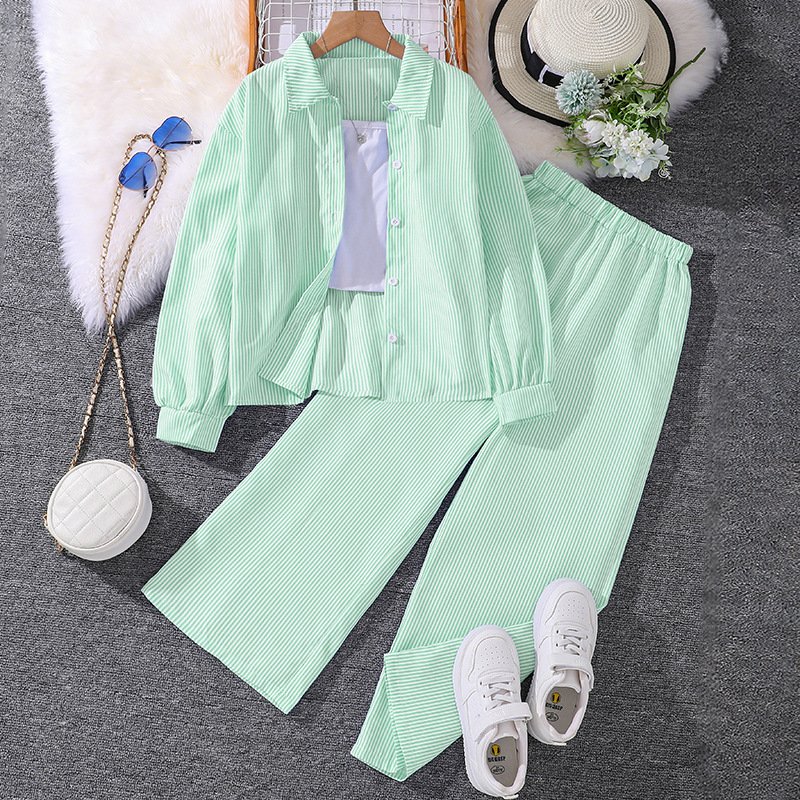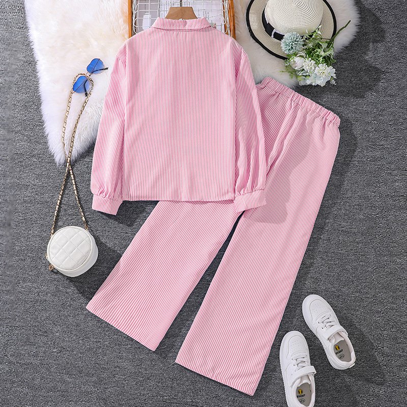 Girls Fashion Casual Stripe Lapel Long-Sleeve Blouse Wide-Leg Pants Two-Piece Set