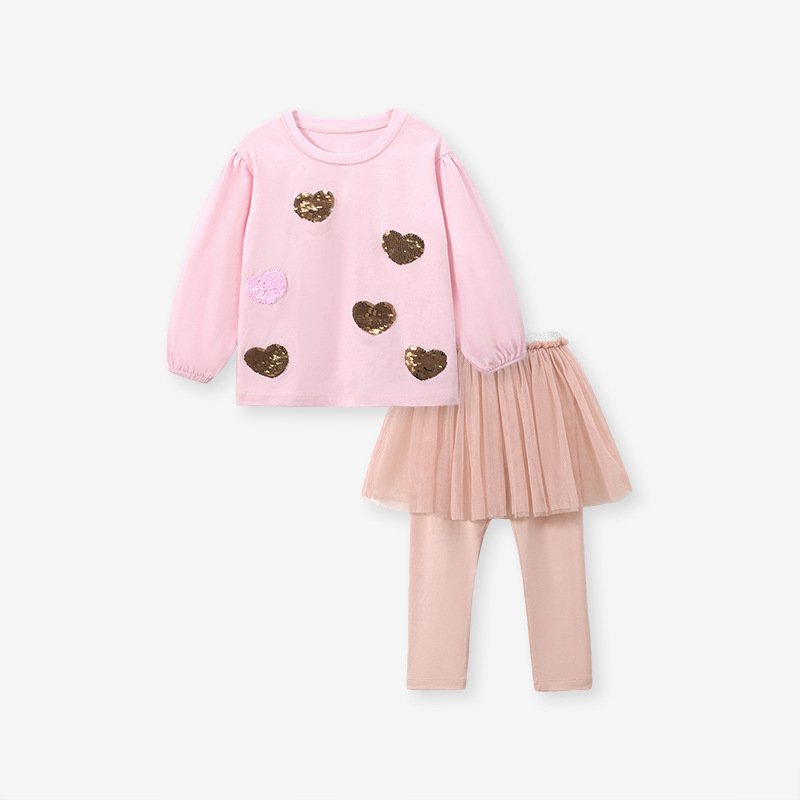 Girls Fashion Heart Shaped Sequin Long Sleeve Top And Mesh Skirt Set