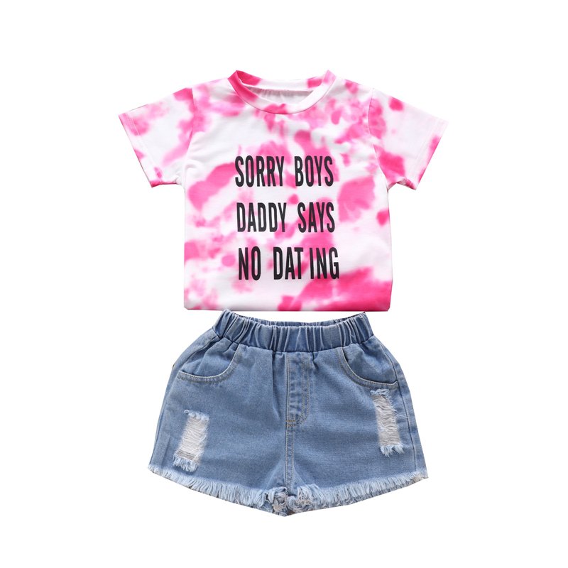 Girls Fashion Letter Pattern Tie-dye T-Shirt And Denim Shorts Set