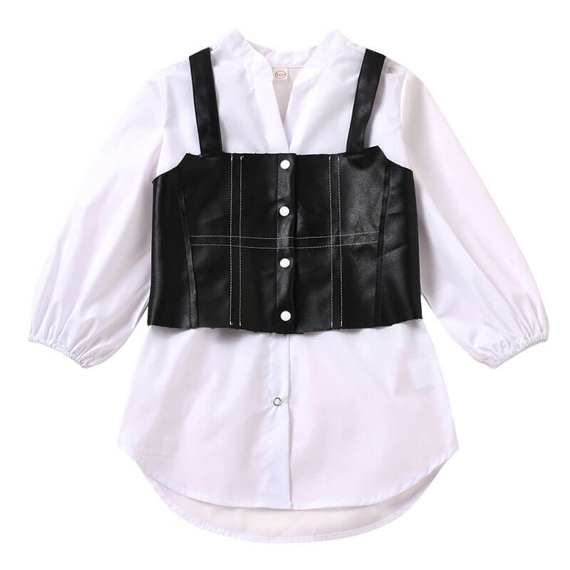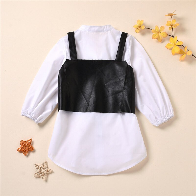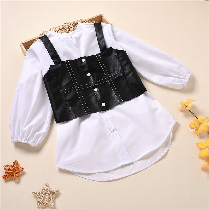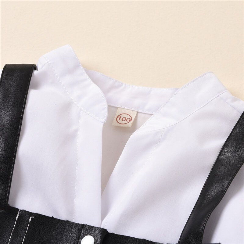 Girls Fashion Long-sleeves Single-breasted Blouse And PU Gallus Set