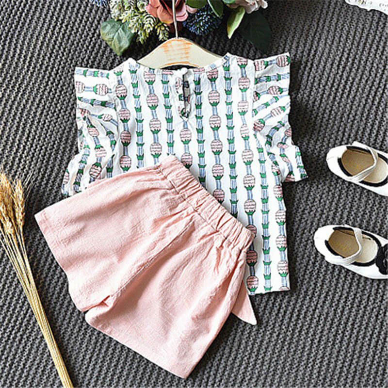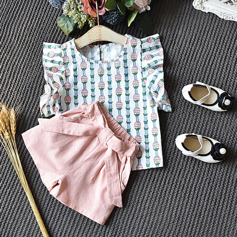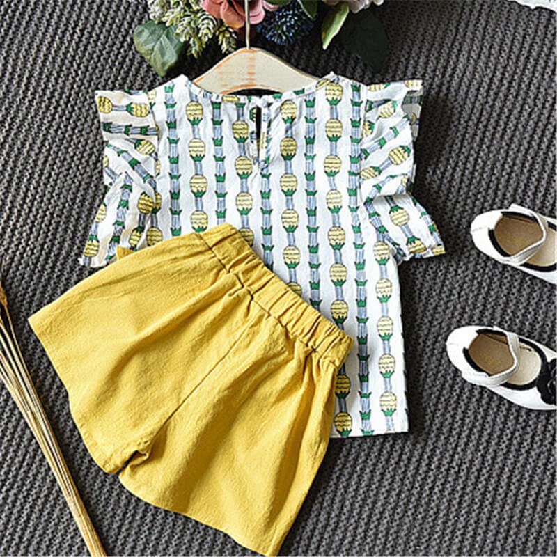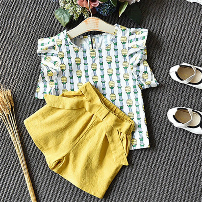 Girls Fashion Pineapple Print Sleeveless Ruffled Tops And Shorts Set