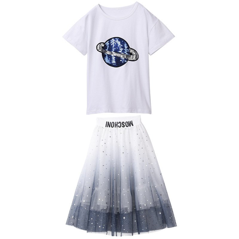 Girls Fashion Round Neck T-Shirt And Mesh Fluffy Skirt Set