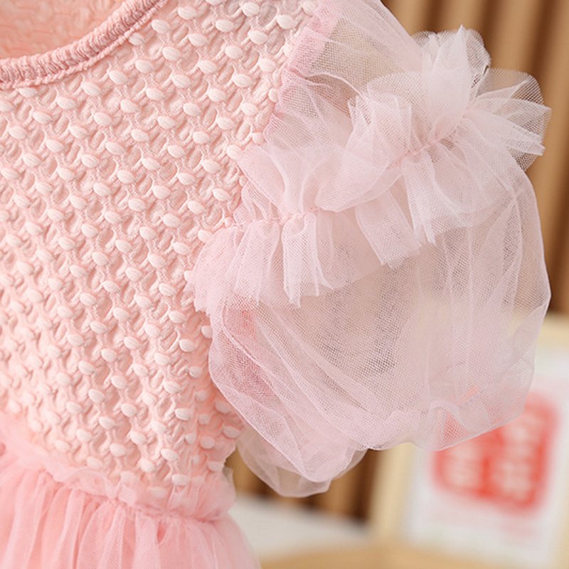 Girls Fashion Solid Color Bubble Sleeve Mesh Dress