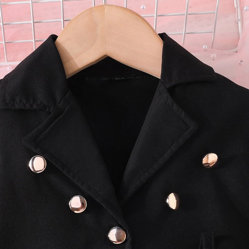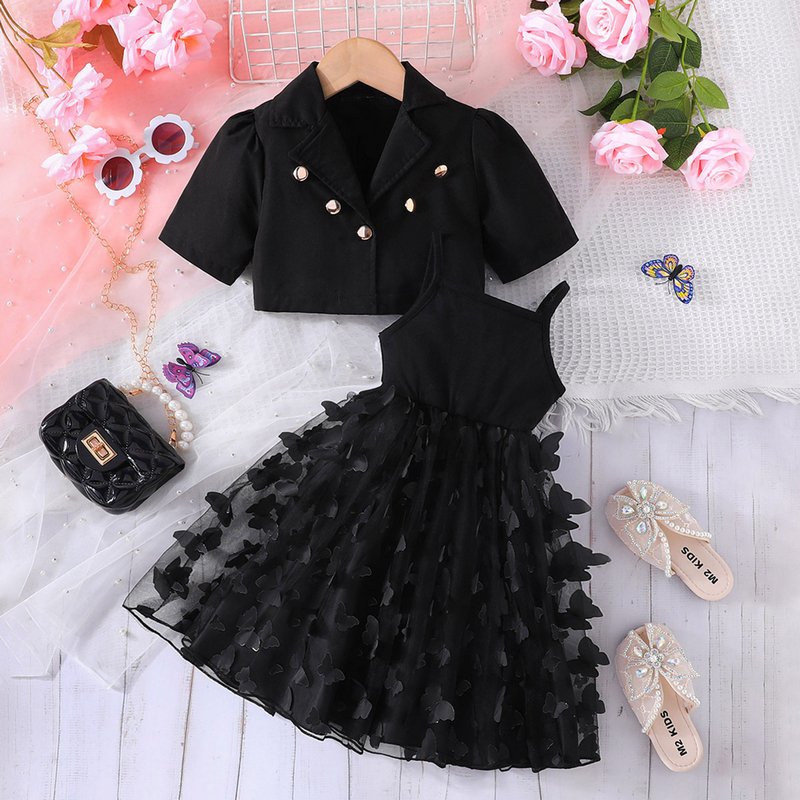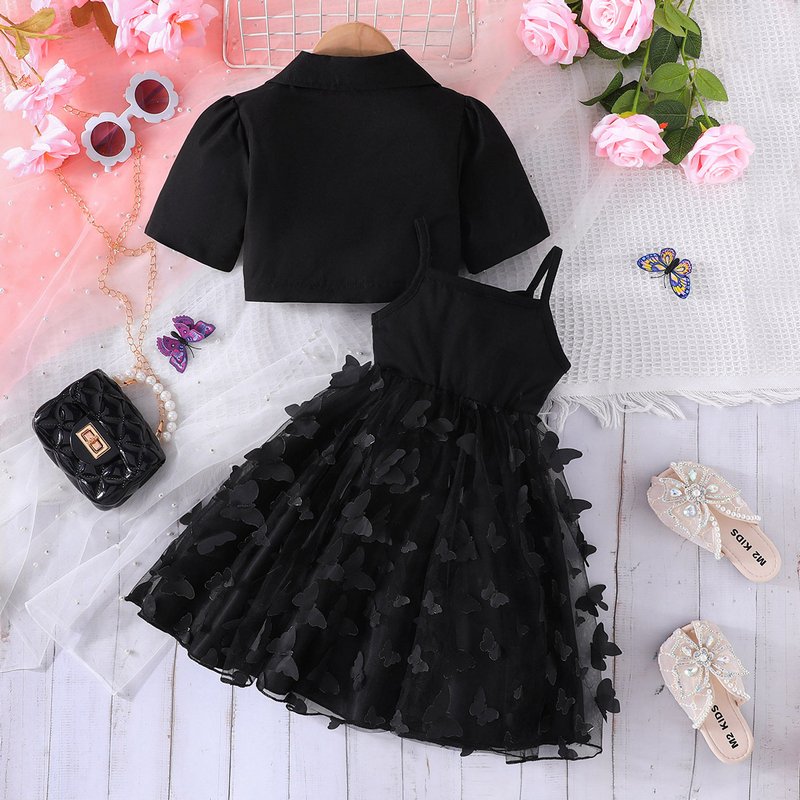 Girls Fashion Solid Color Coat Butterfly Mesh Sling Long Dress Two-Piece Set
