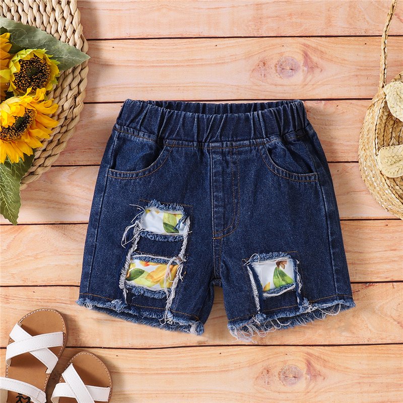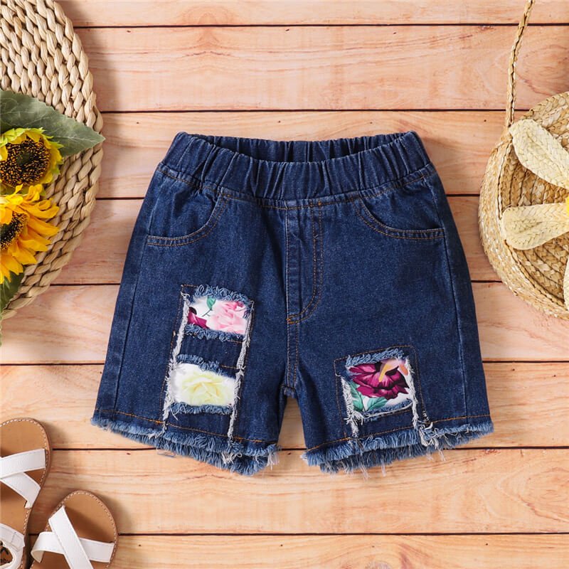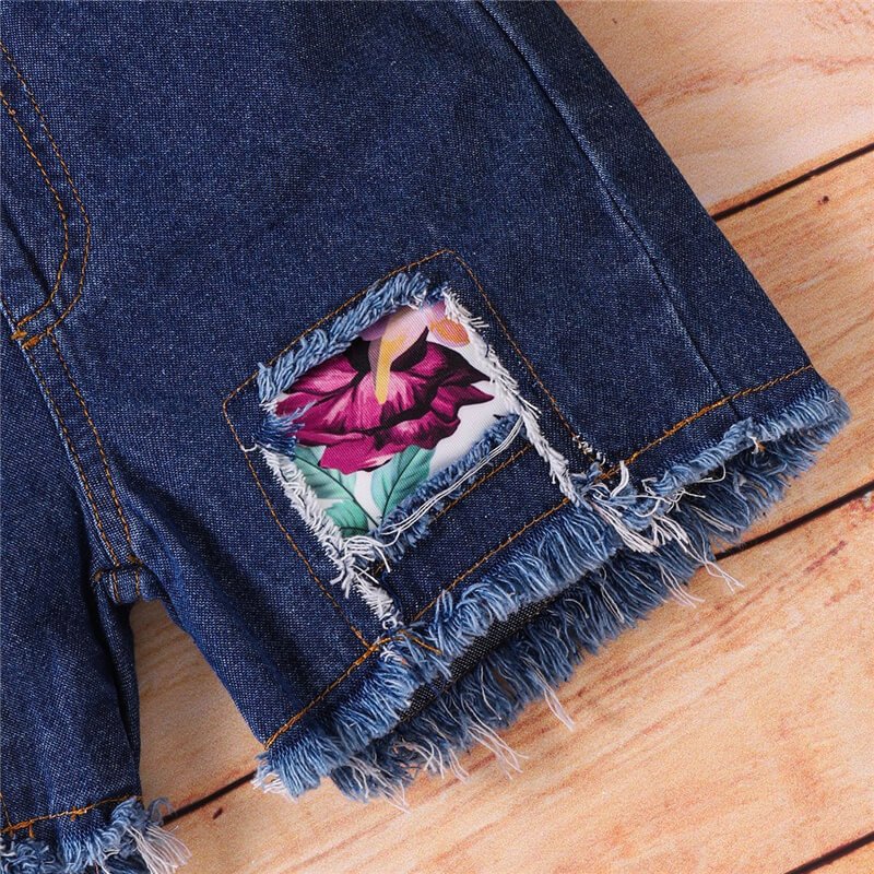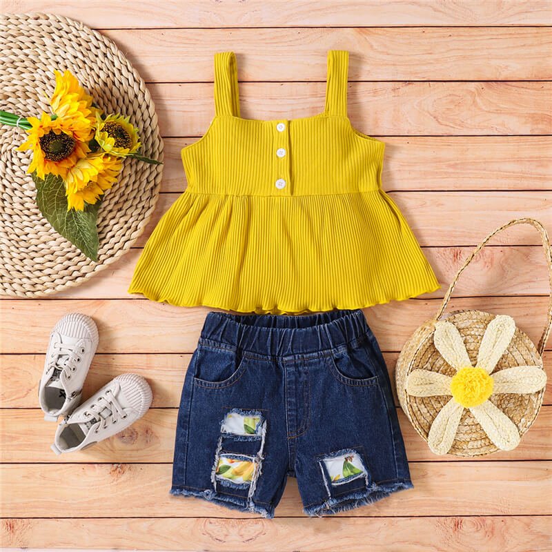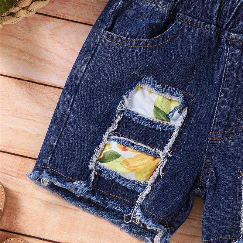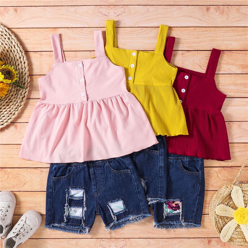 Girls Fashion Solid Color Halter Tops And Ripped Denim Shorts Set