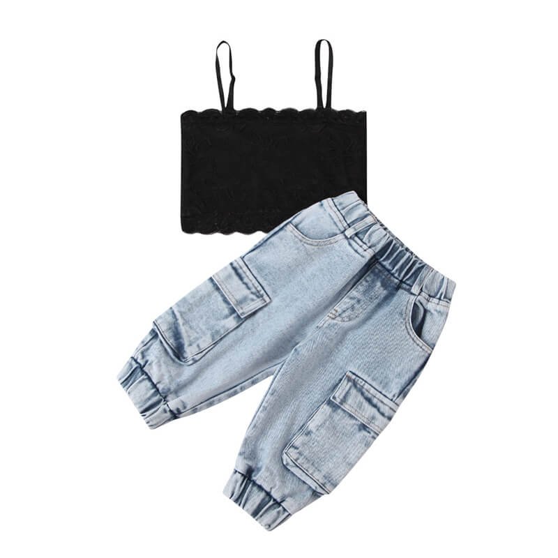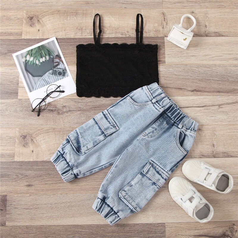 Girls Fashion Solid Color Lace Camisole And Jeans Set