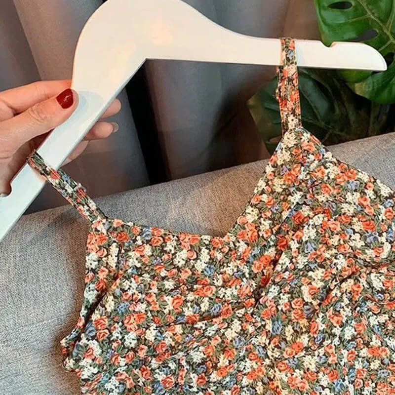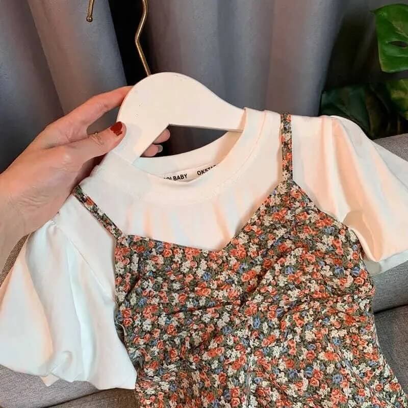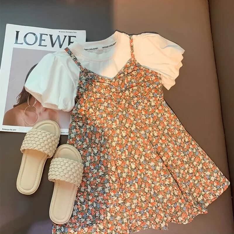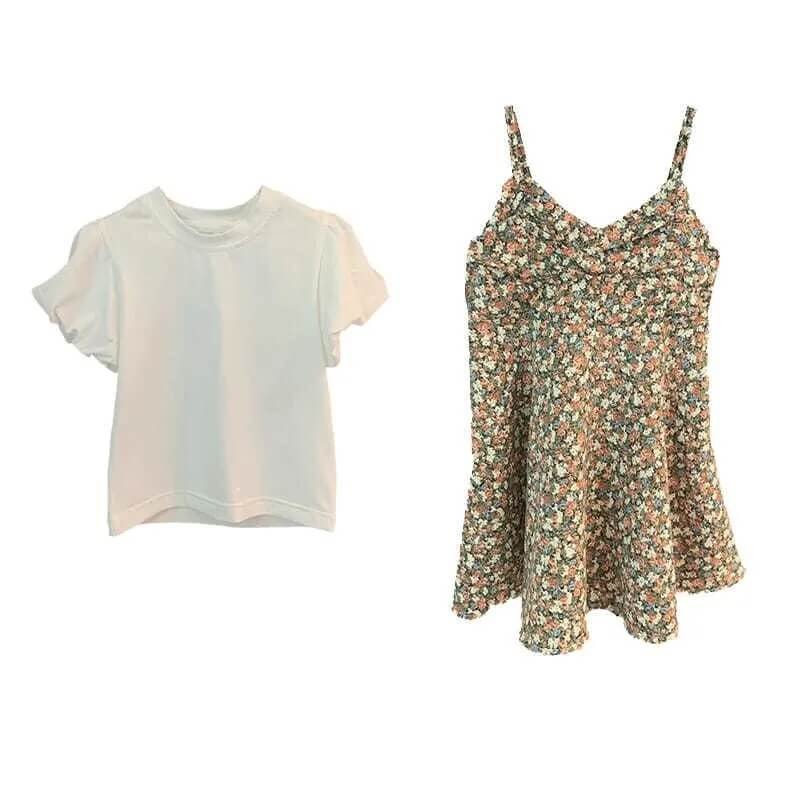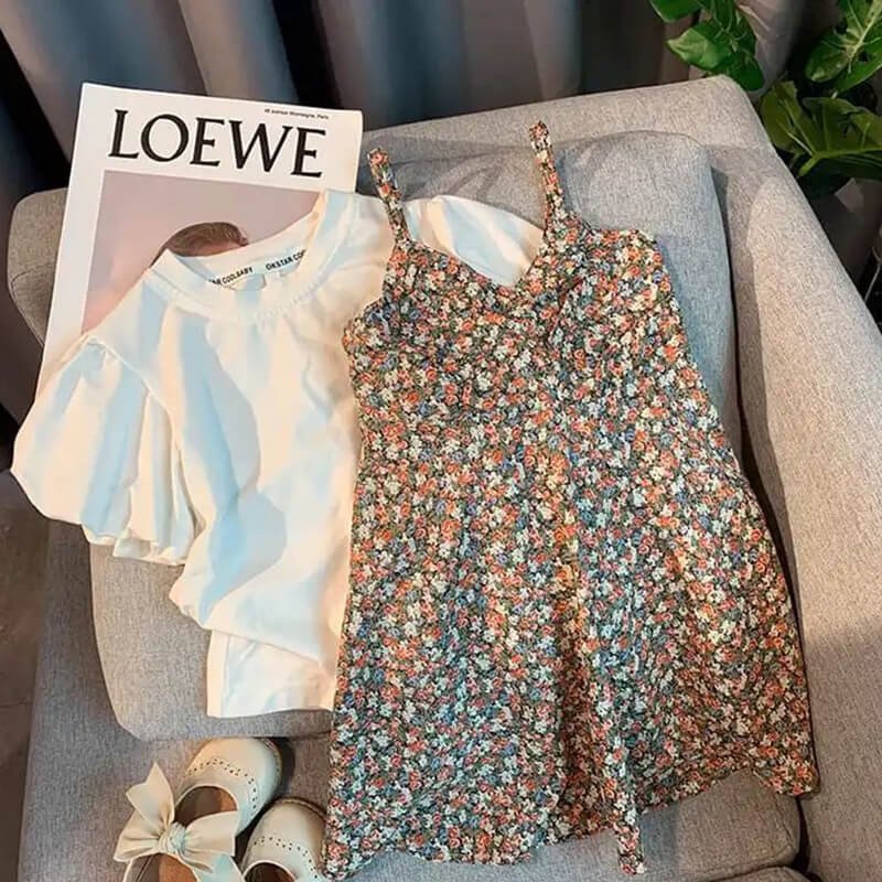 Girls Fashion Solid Color Puffed Sleeves Tops And Floral Slip Dress Set