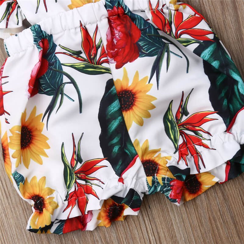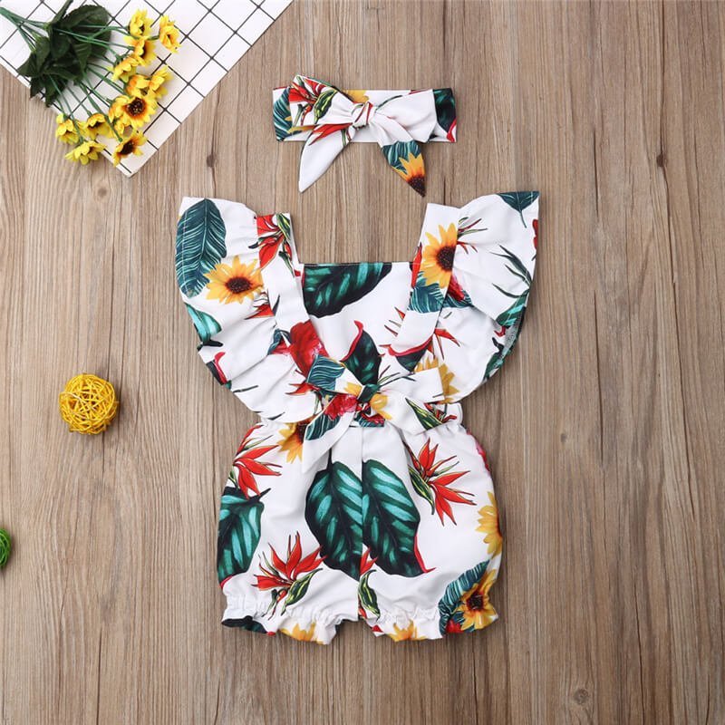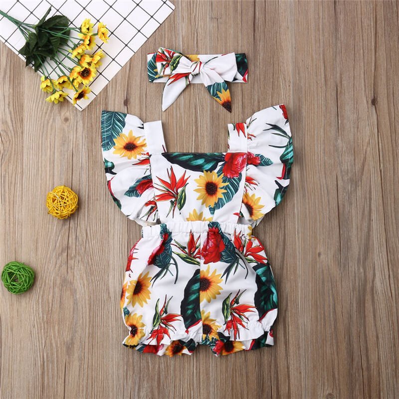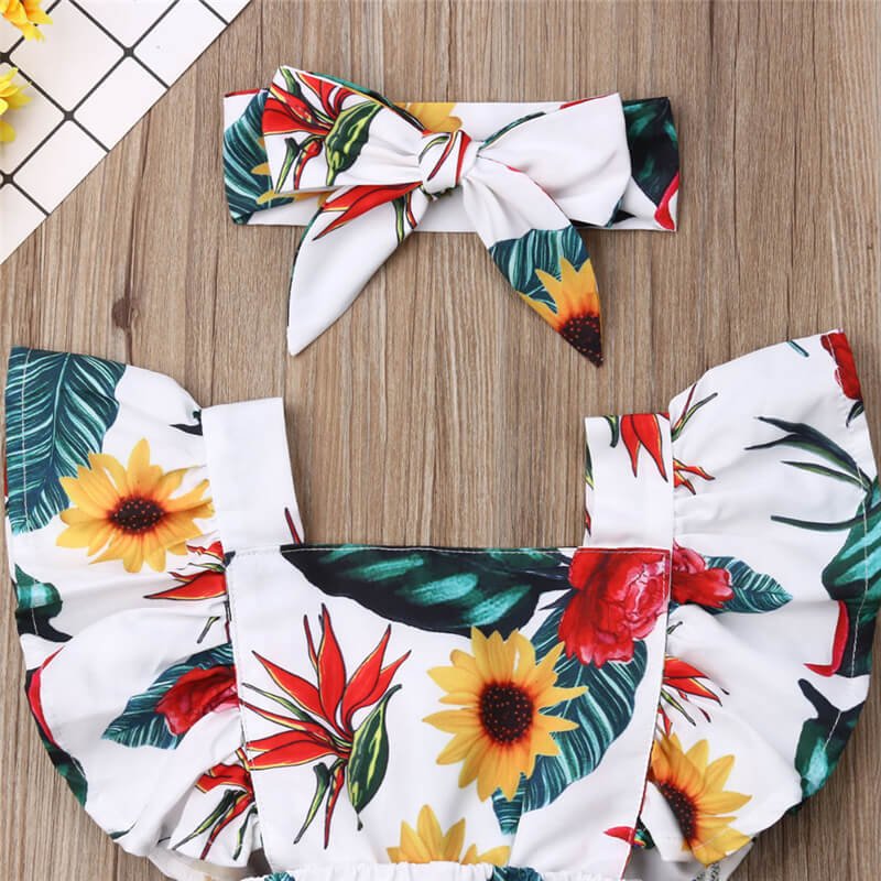 Girls Flower Pattern Stringy Selvedge Sleeveless Design Romper With Headband