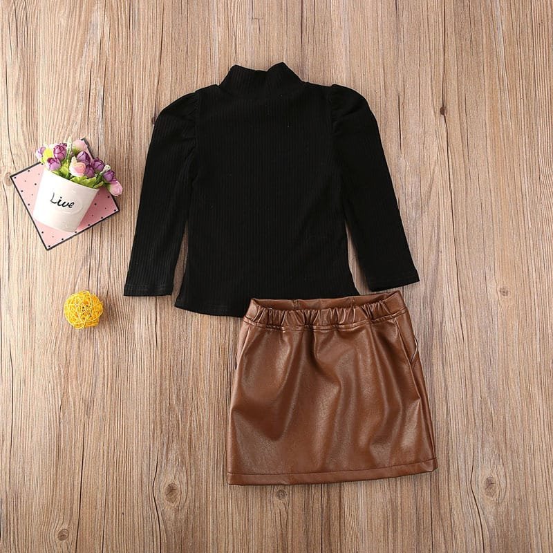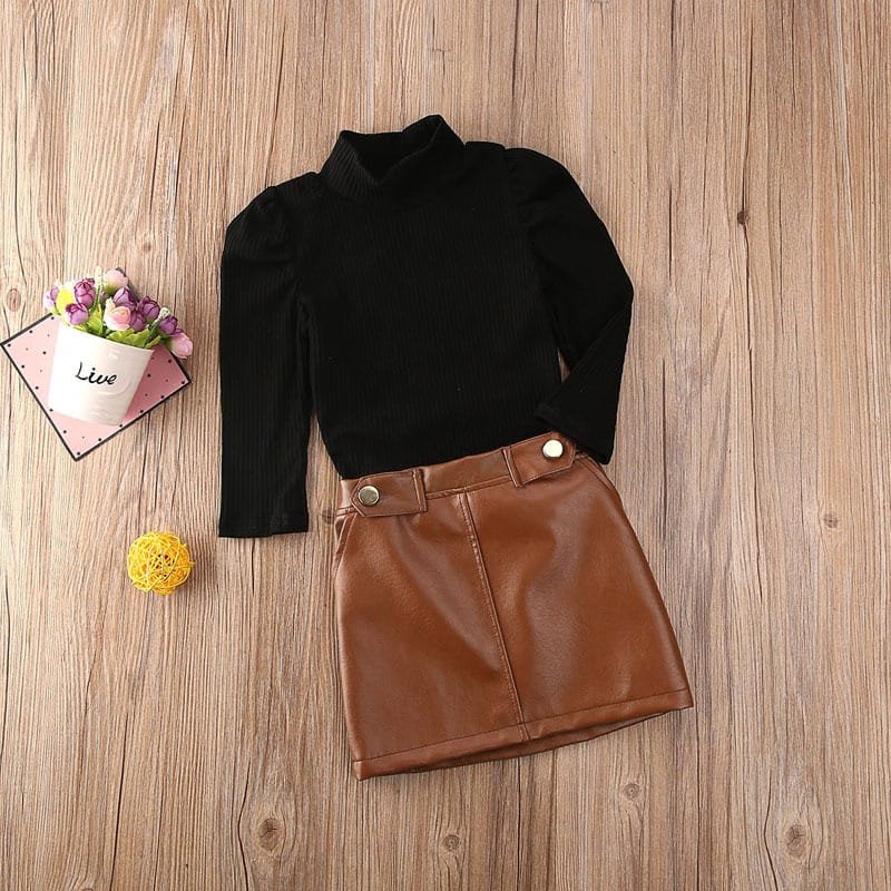 Girls High Collar Long-sleeves Solid Color Tops And PU Skirt Set