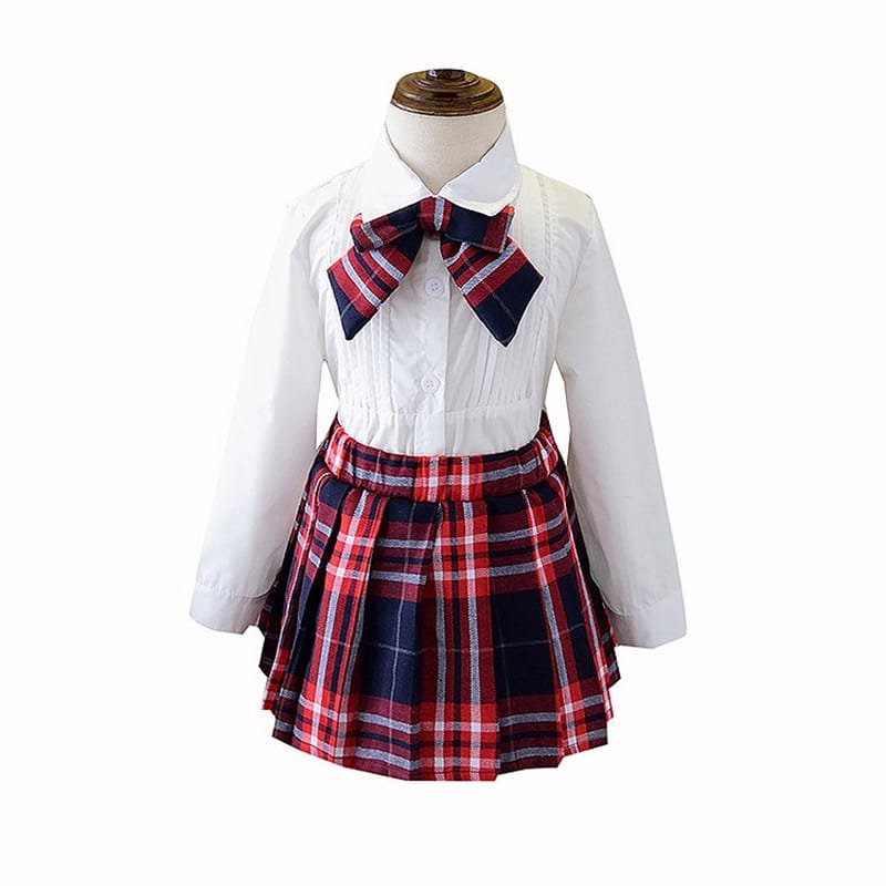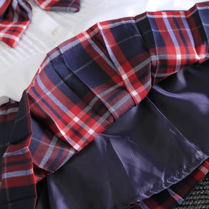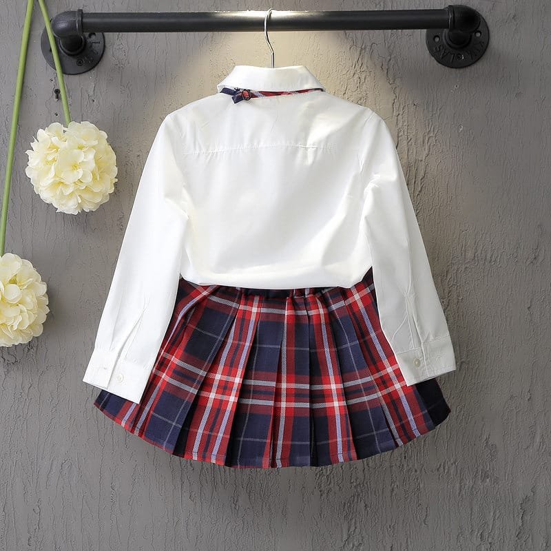 Girls Lapel Design Bowknot Decor Blouse And Plaid Skirt Set