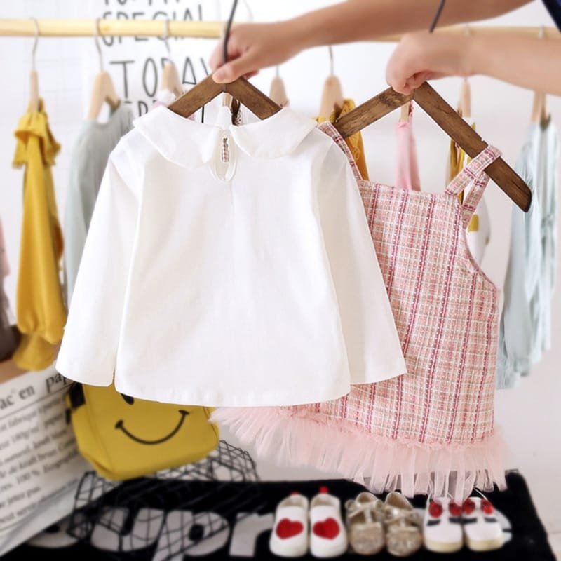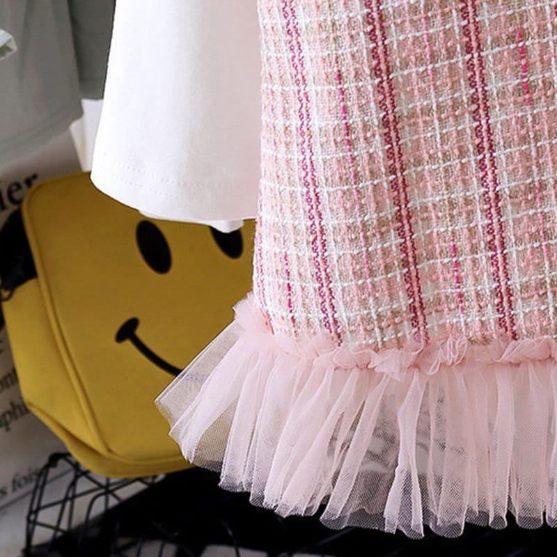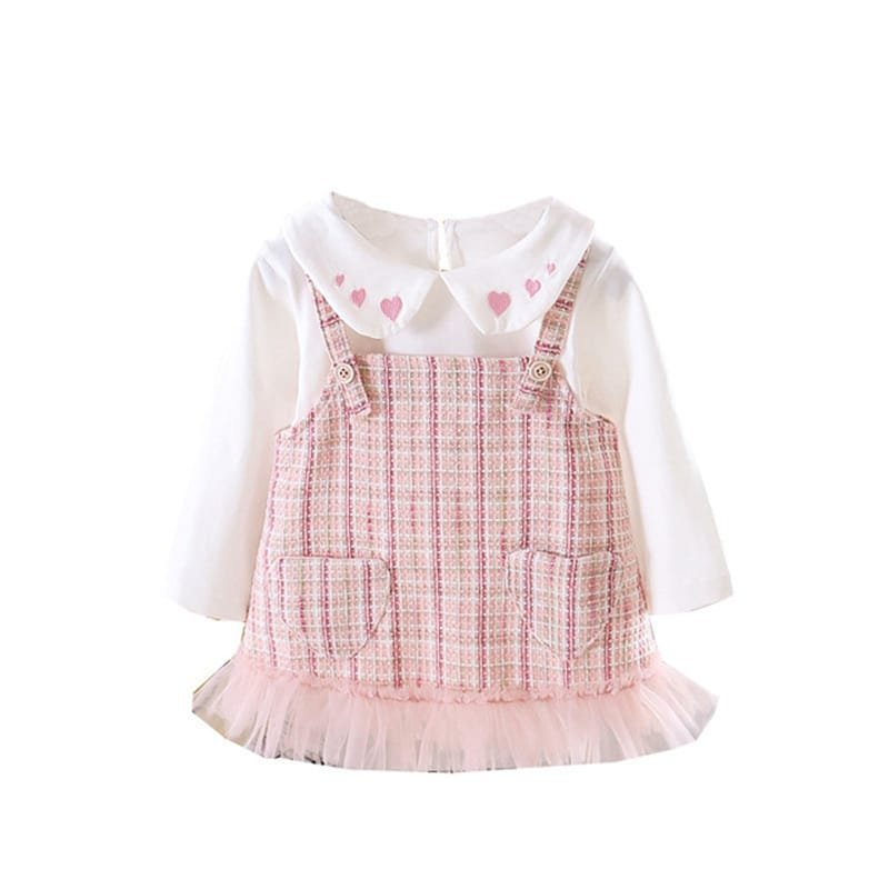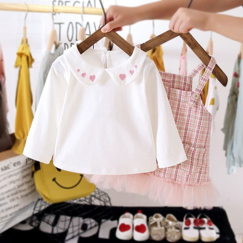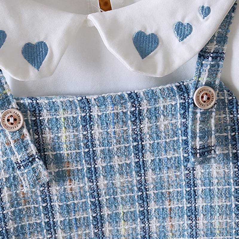 Girls Lapel Design Heart Embroidery Tops And Suspender Skirt Set