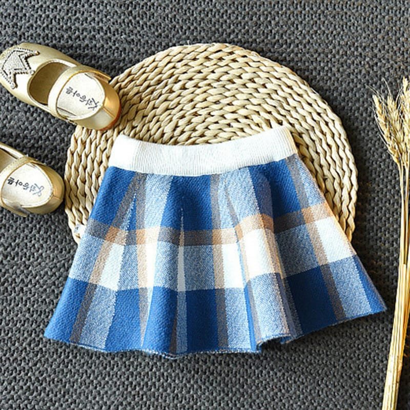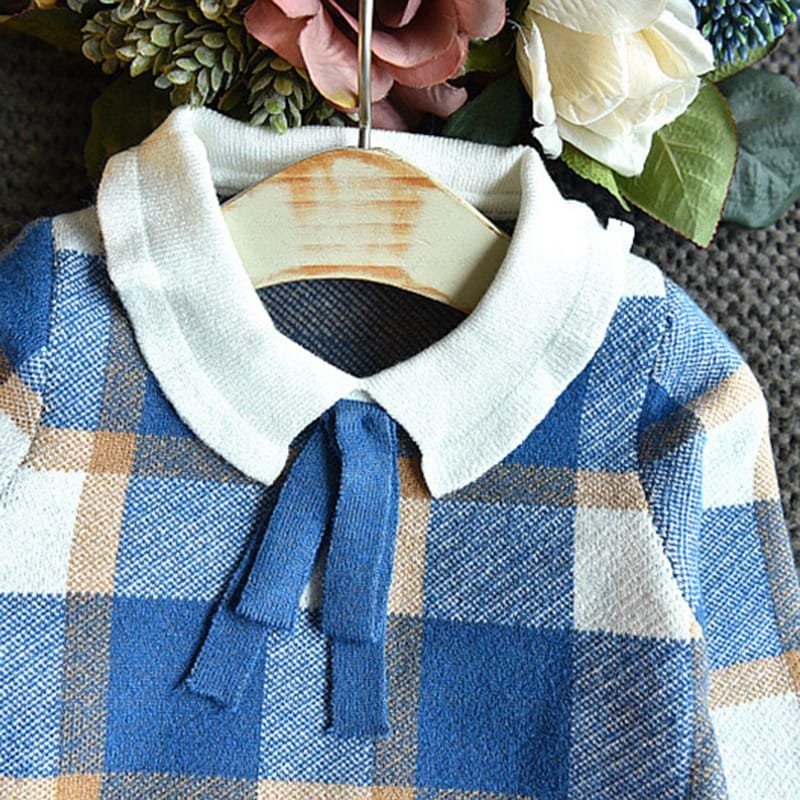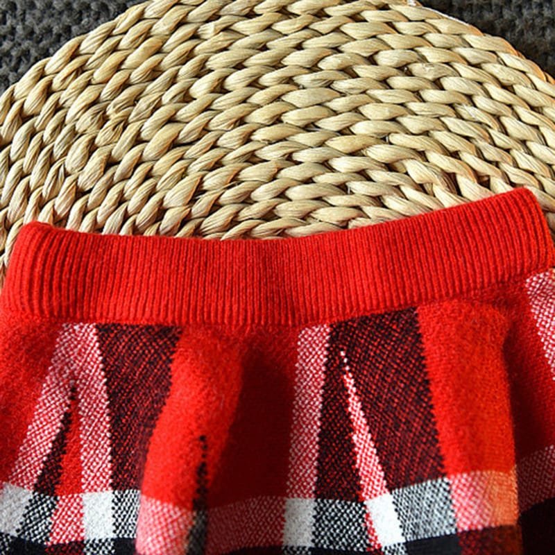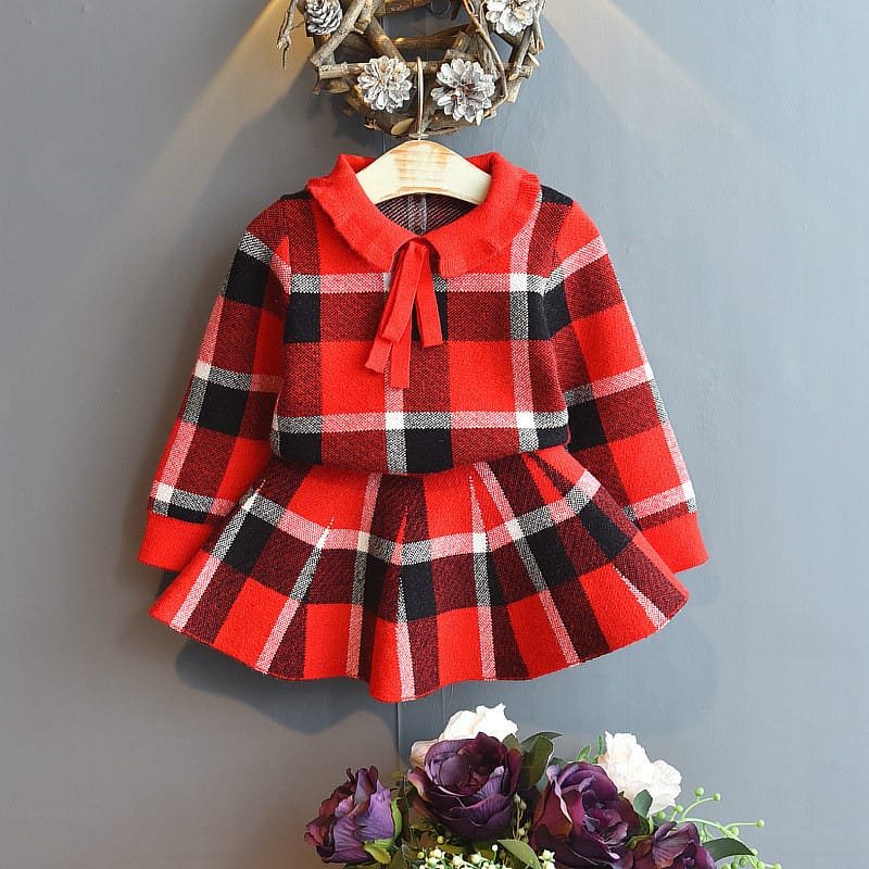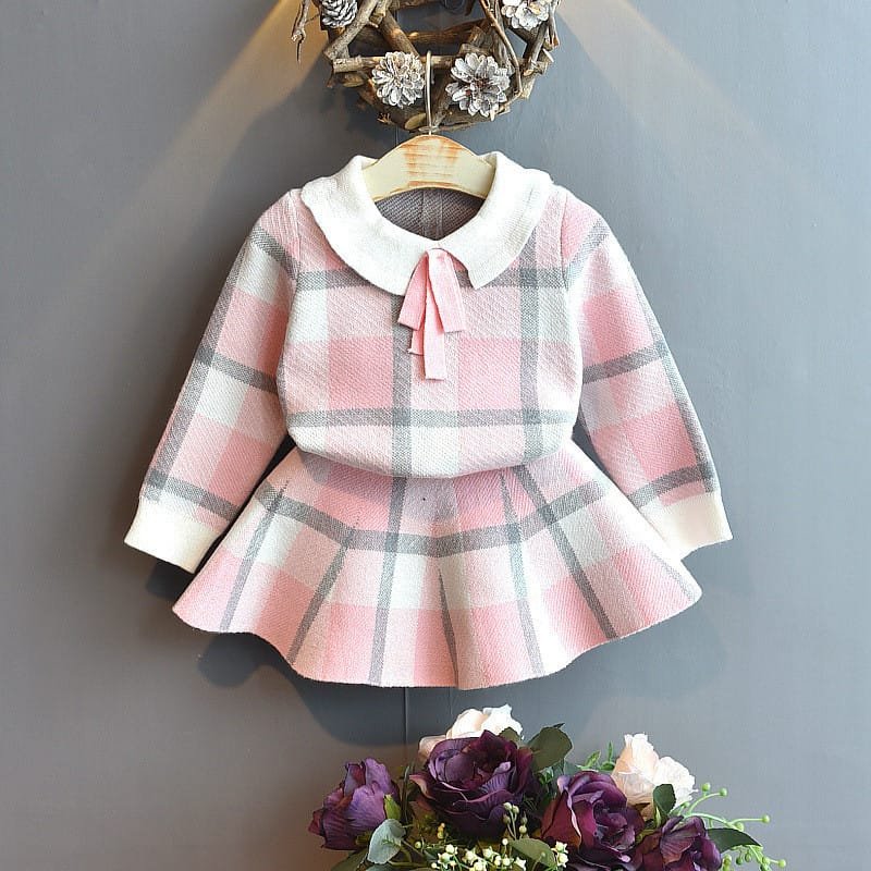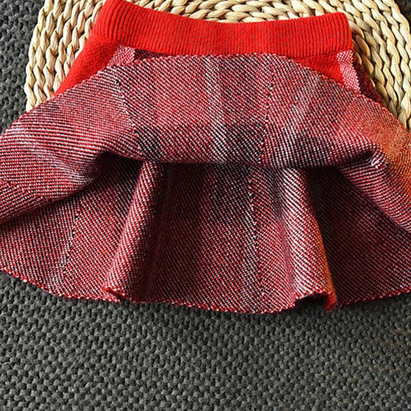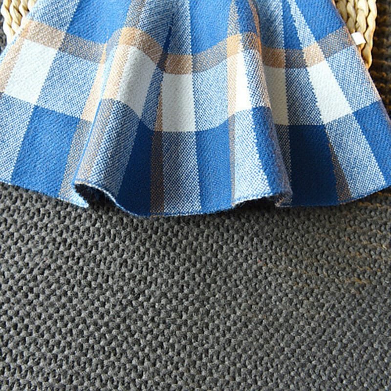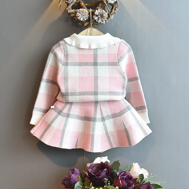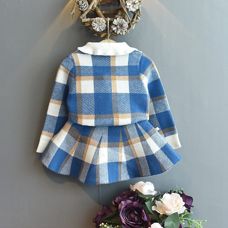 Girls Lapel Design Plaid Tops And Skirt Set