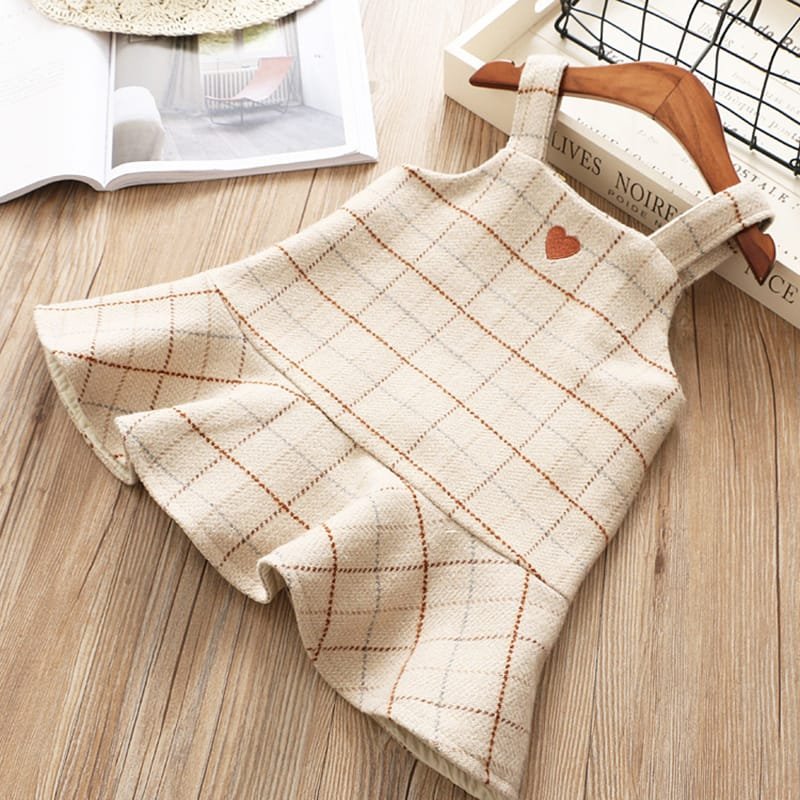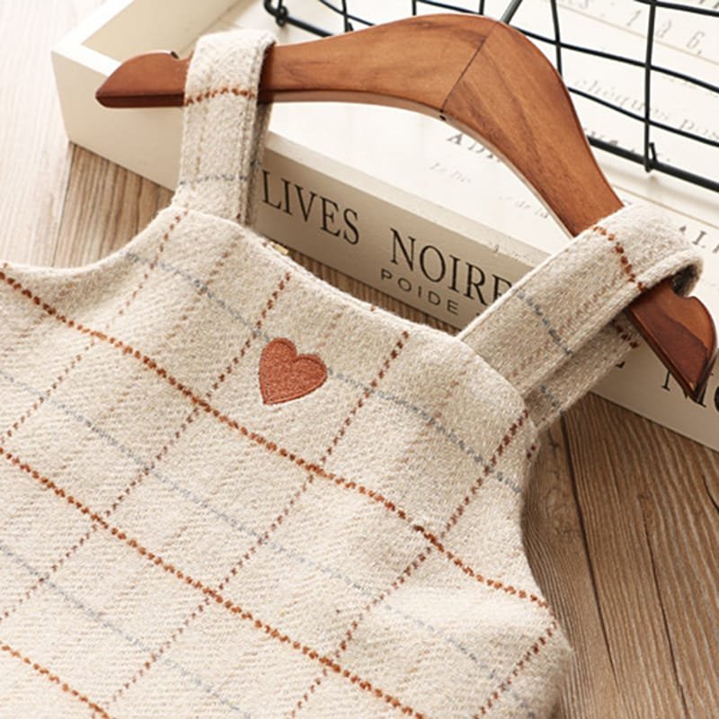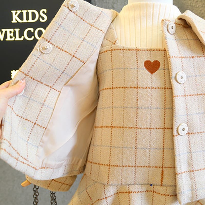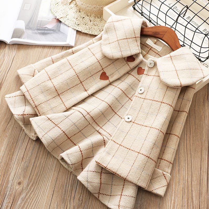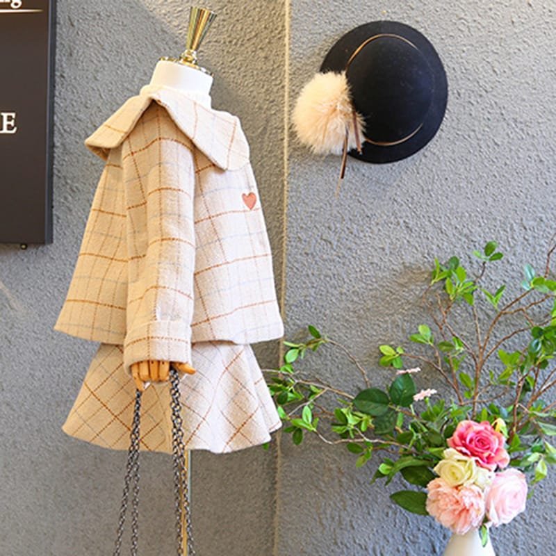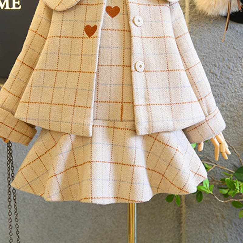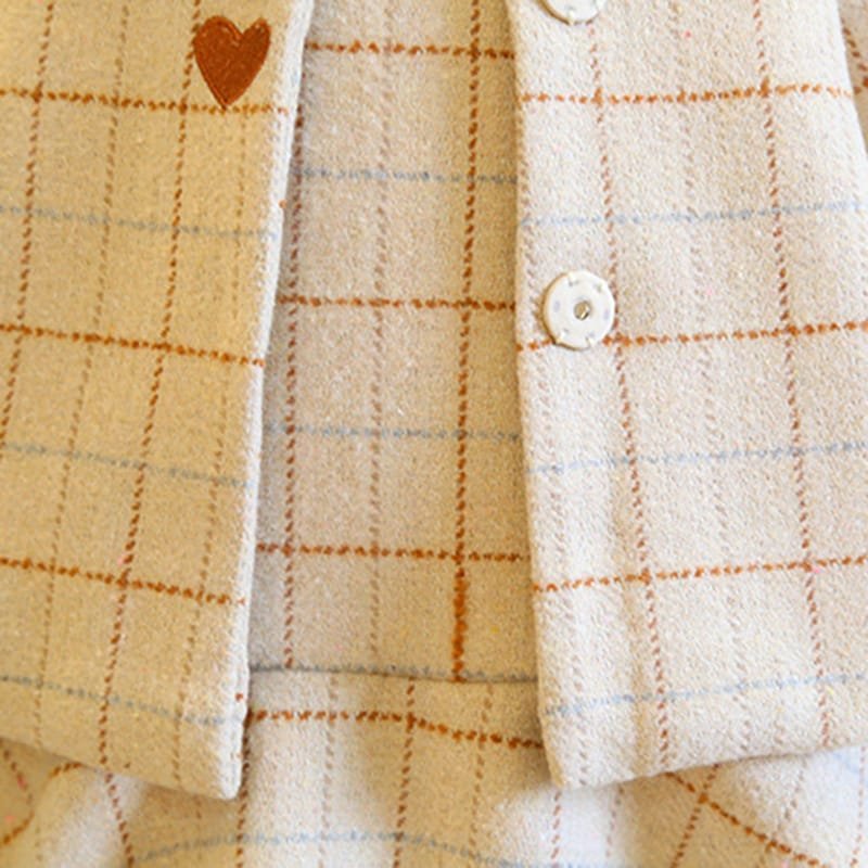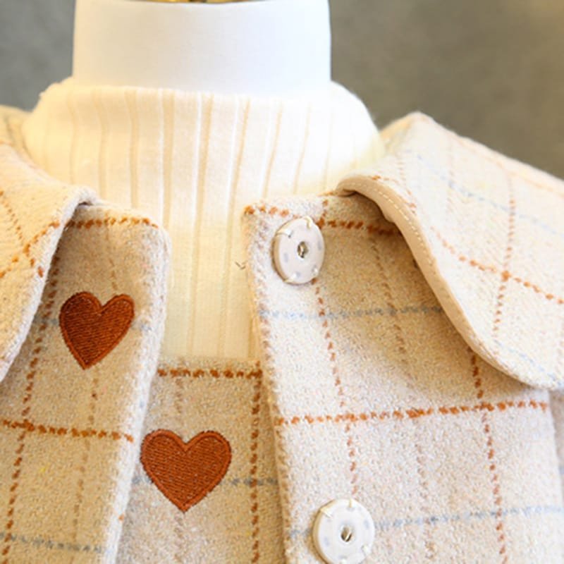 Girls Lapel Plaid Heart Pattern Coat And Flounced Dress Two-piece Set