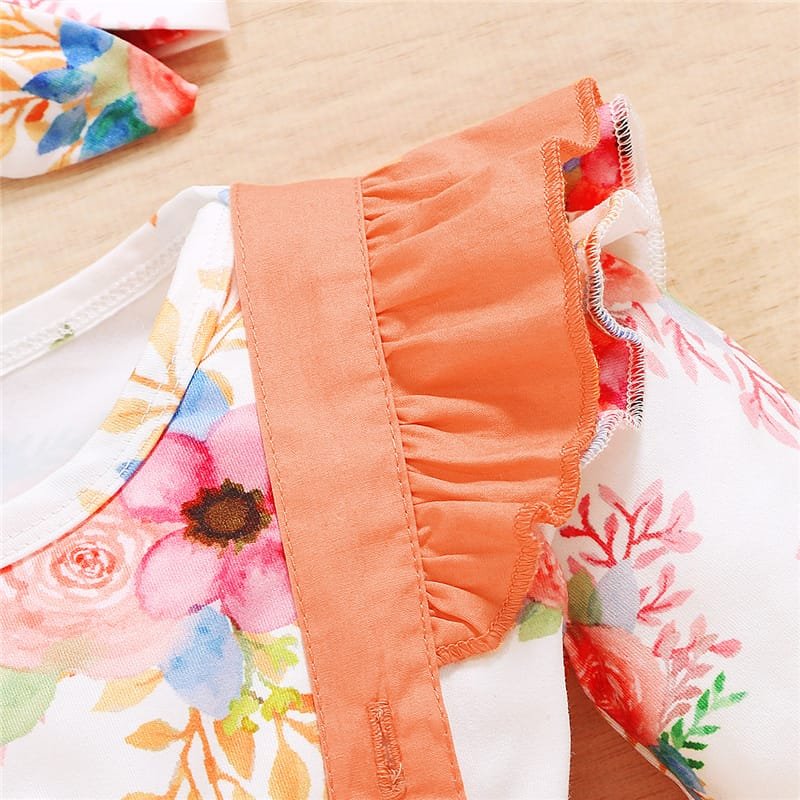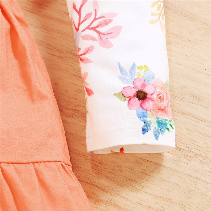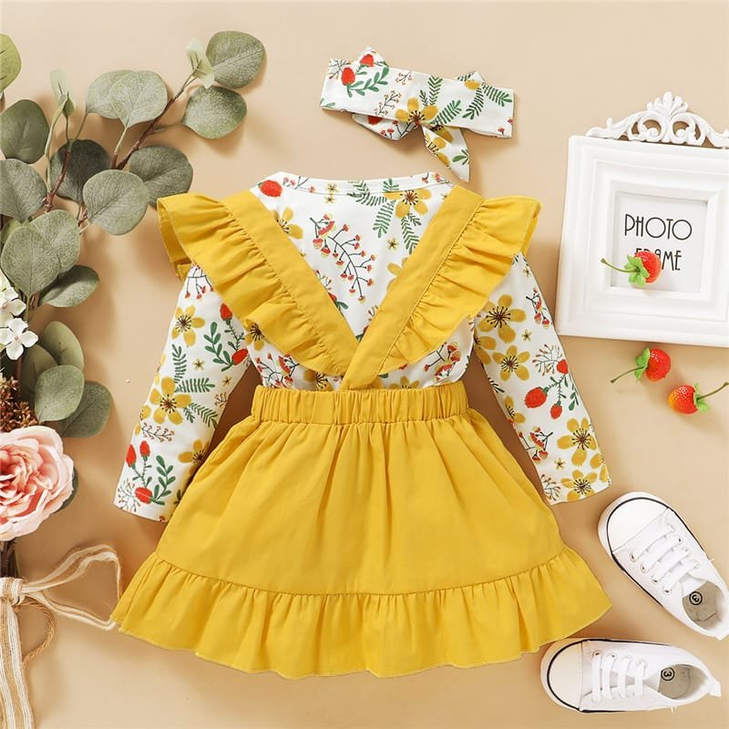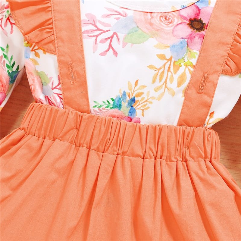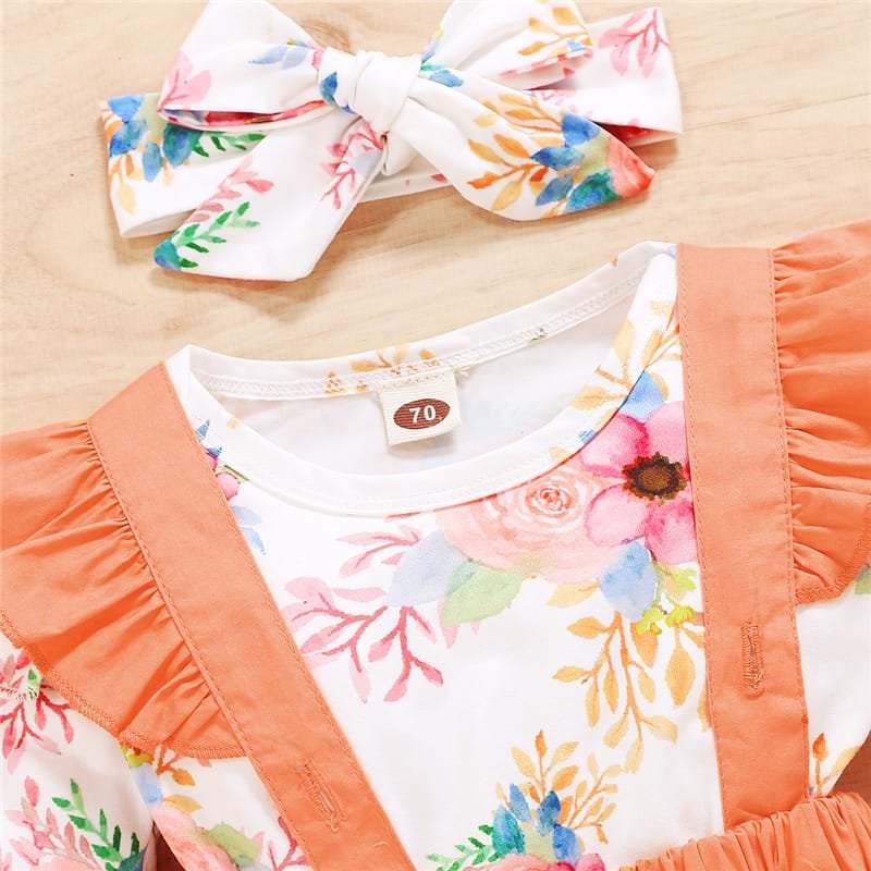 Girls Long-sleeves Flower Pattern Romper And Suspender Skirt With Headband