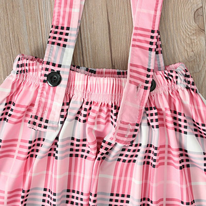 Girls Long-sleeves Ruffled Heart Pattern T-Shirt And Plaid Suspender Skirt Set