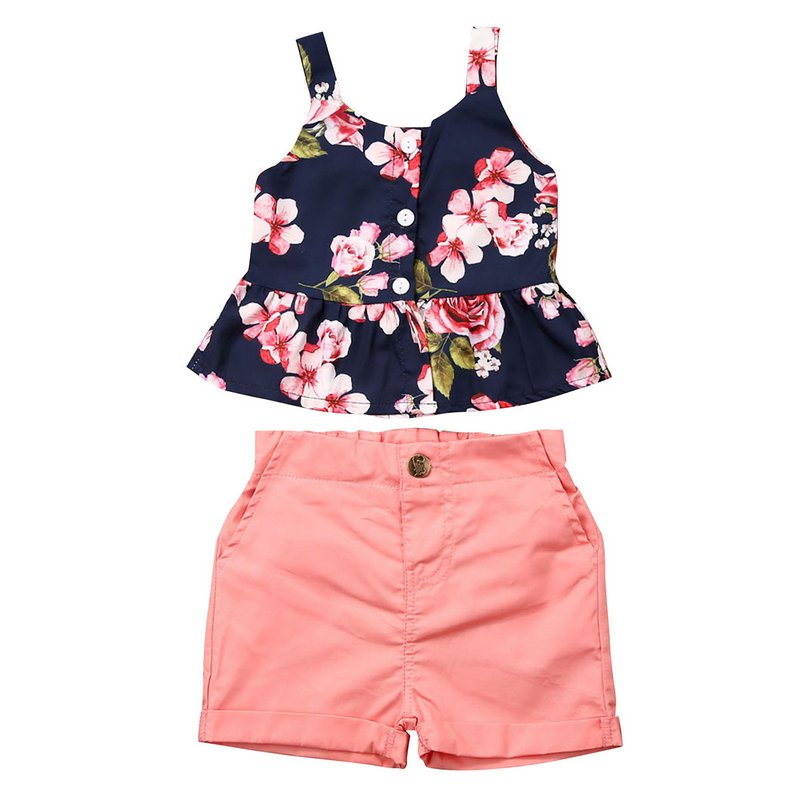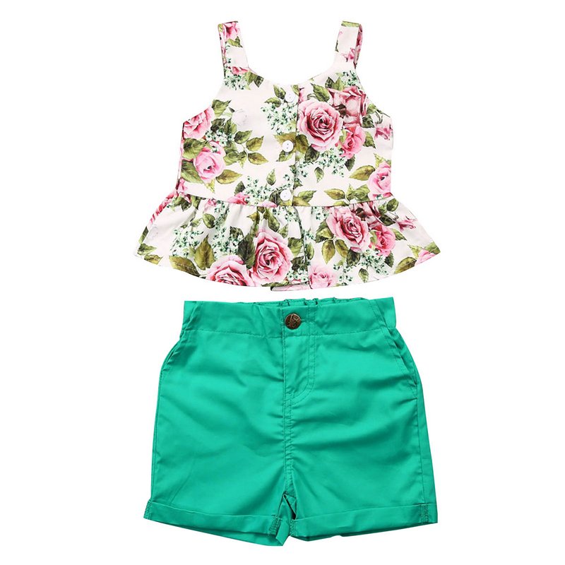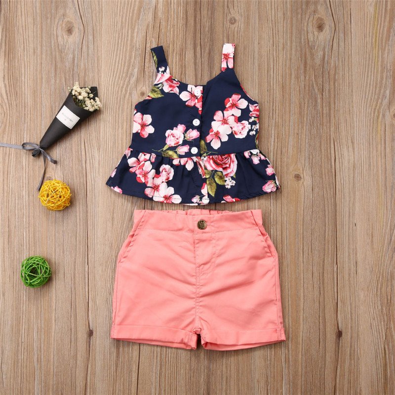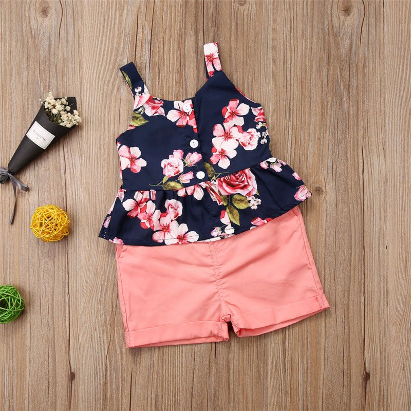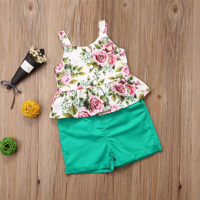 Girls Pastoral Flower Pattern Ruffled Sleeveless Top And Shorts Set