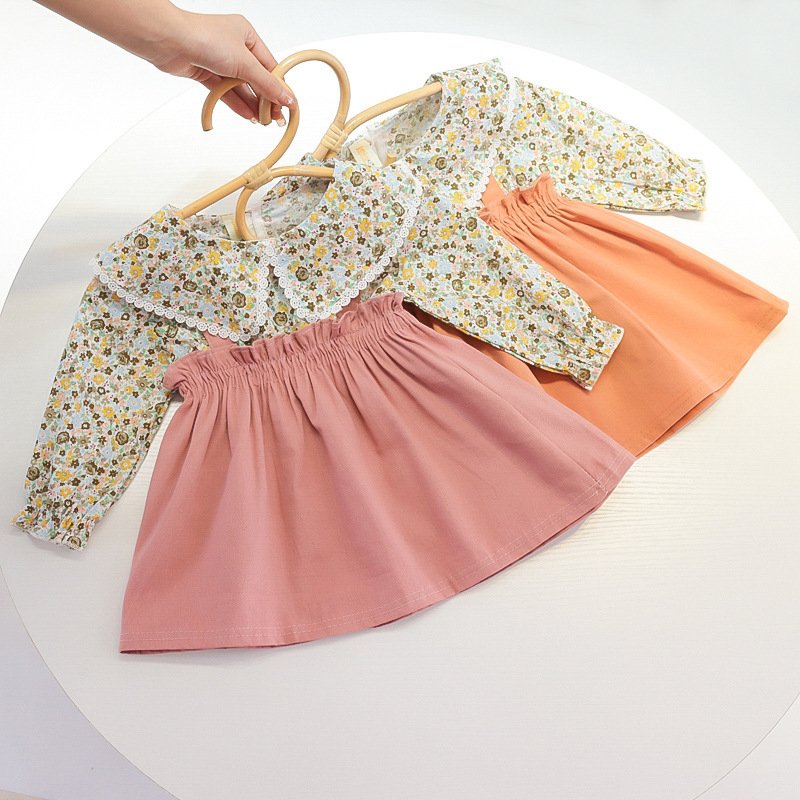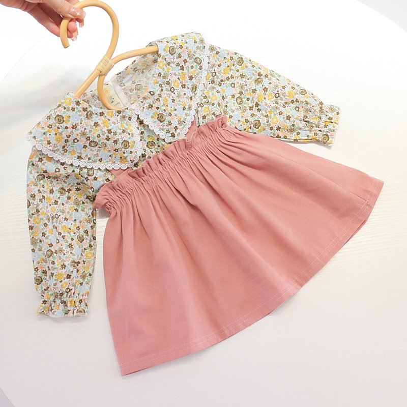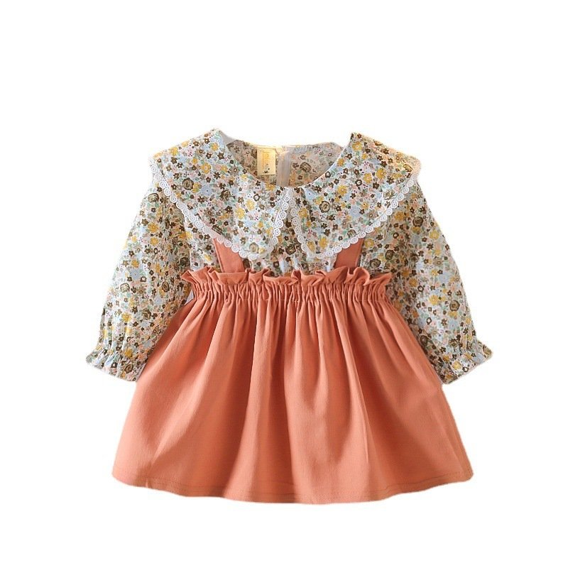 Girls Pastoral Lapel Long Sleeve Fake Two Pieces Pleated Design Dress