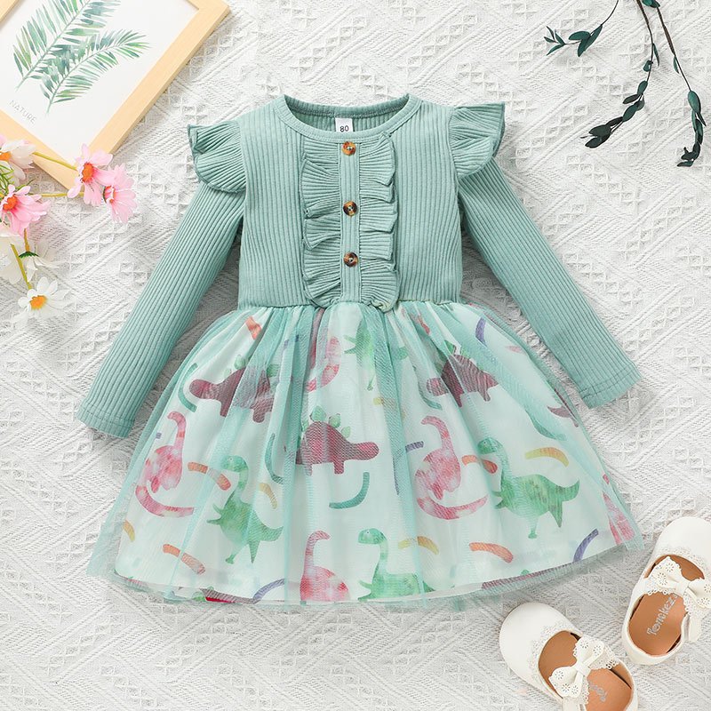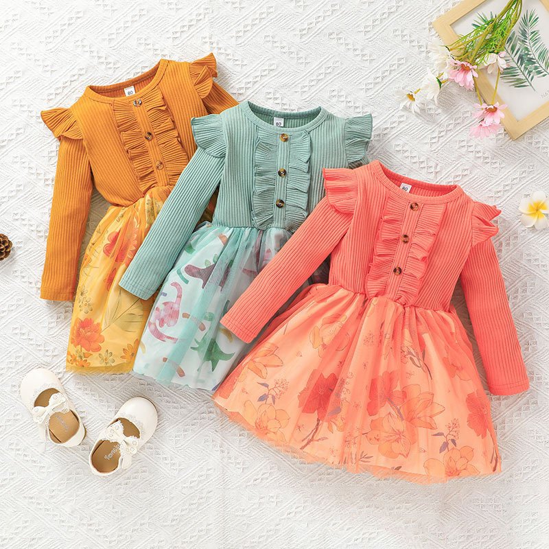 Girls Retro Round Long Sleeve Stringy Selvedge Flower Mesh Dress