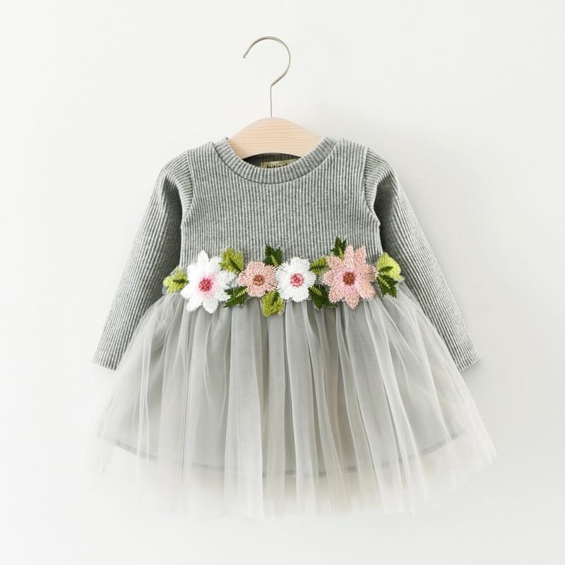 Girls Round Neck Flower Embroidery Design Mesh Fluffy Dress