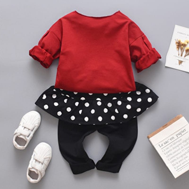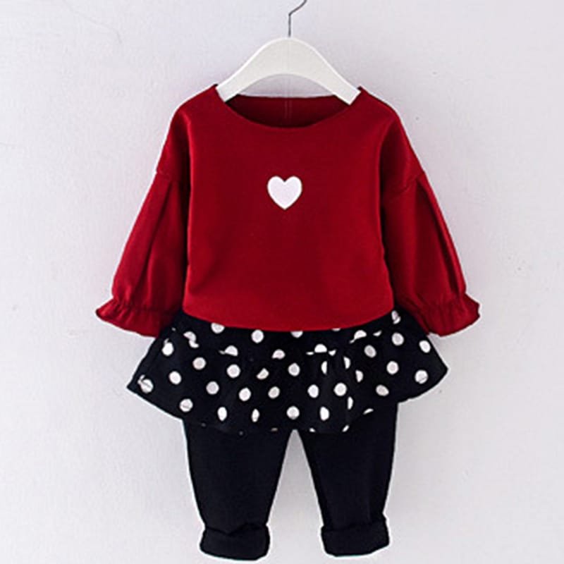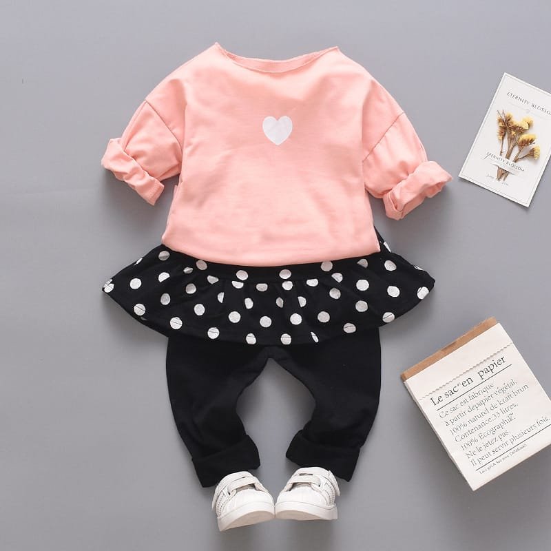 Girls Round Neck Heart Printed Tops And Polka Dot Culotte Set